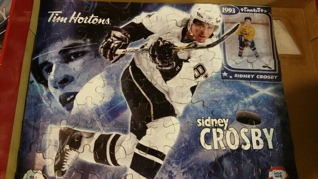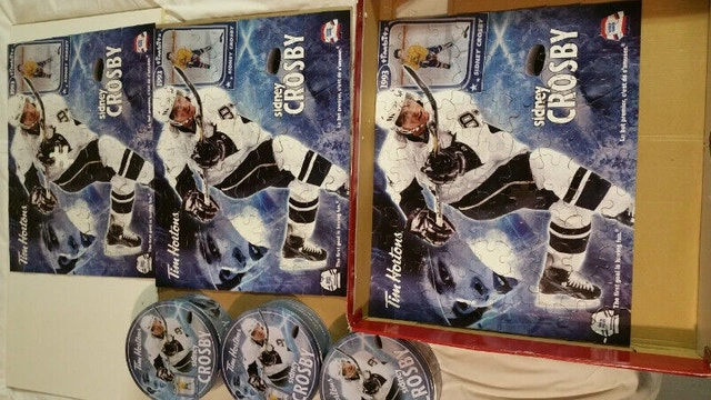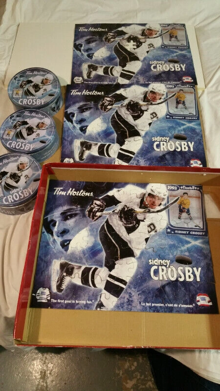 Tim Hortons Sidney Crosby NHL Penguins 100 Piece Puzzle Tin Box (2009) COMPLETE. Up for sale we have 3 x Sidney Crosby 100 piece Puzzle. Save as collector item or use it. Give as gift. Each tin can are 7 1/2 x 2 3/4. One Puzzle is missing one piece as shown in photo. ALL IN GREAT CONDITION. ASKING $20 FOR ALL 3