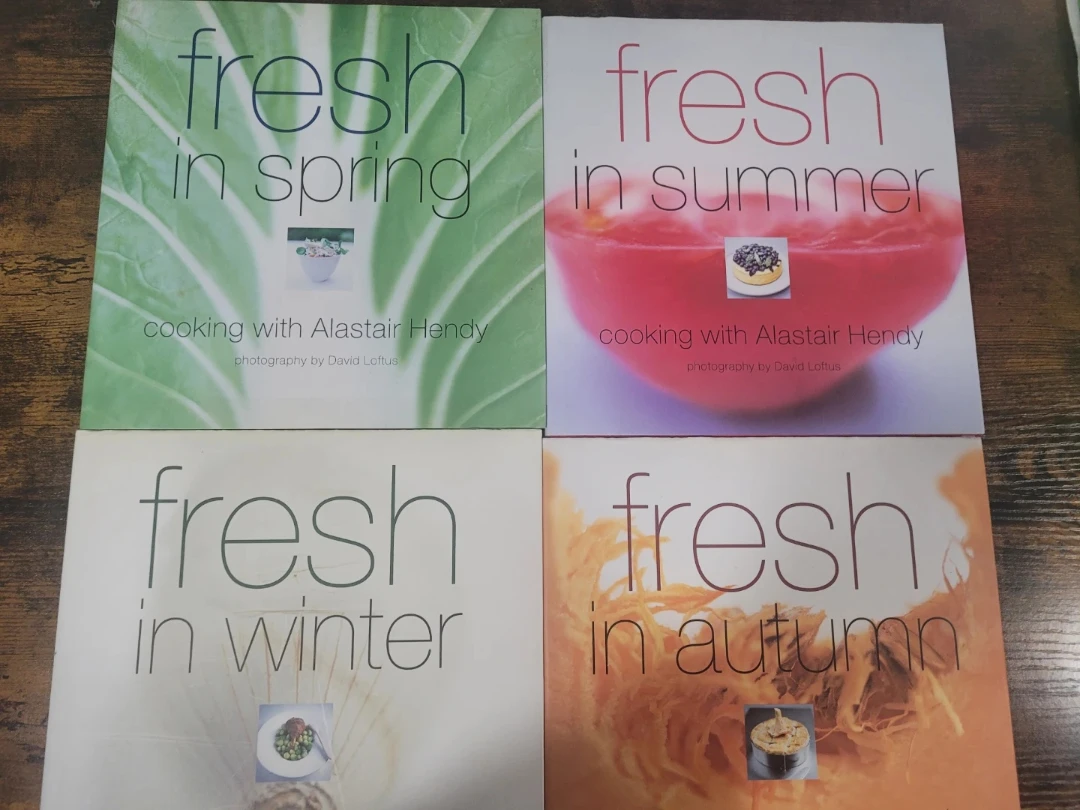 Selling a set of 'Fresh in' seasonal cookbooks by Alastair Hendy! The set includes: Fresh in Spring, Fresh in Summer, Fresh in Winter, and Fresh in Autumn. These cookbooks feature simple, easy, and spectacular seasonal recipes for ingredients like squash, nuts, mushrooms, apples, and pears.