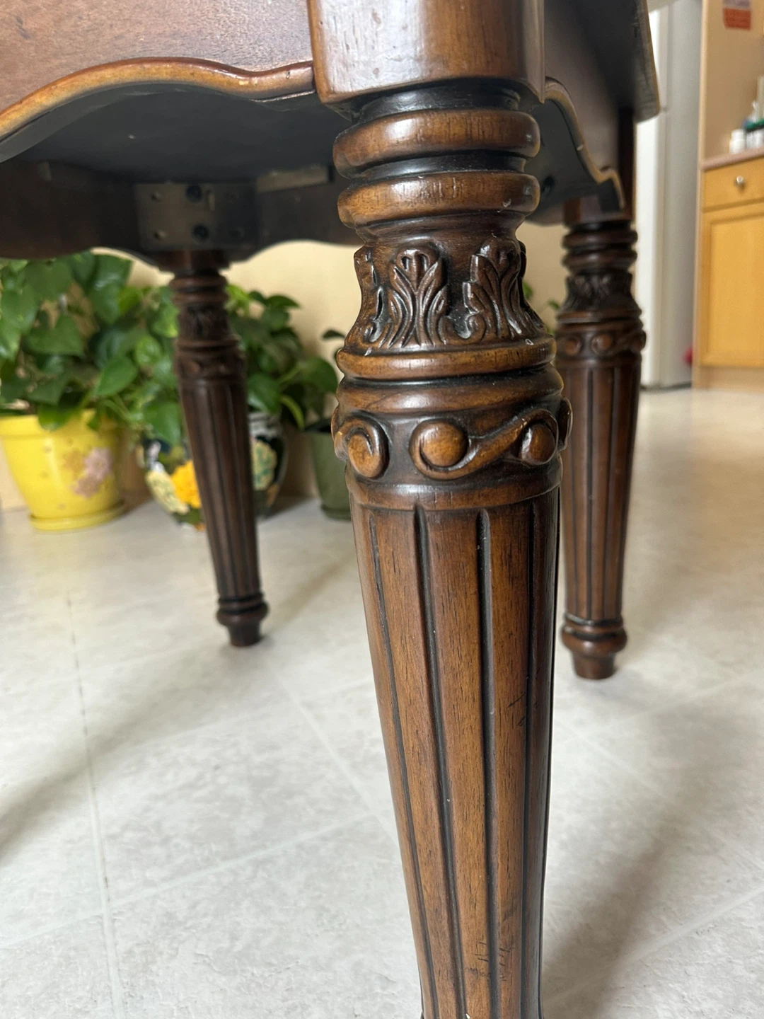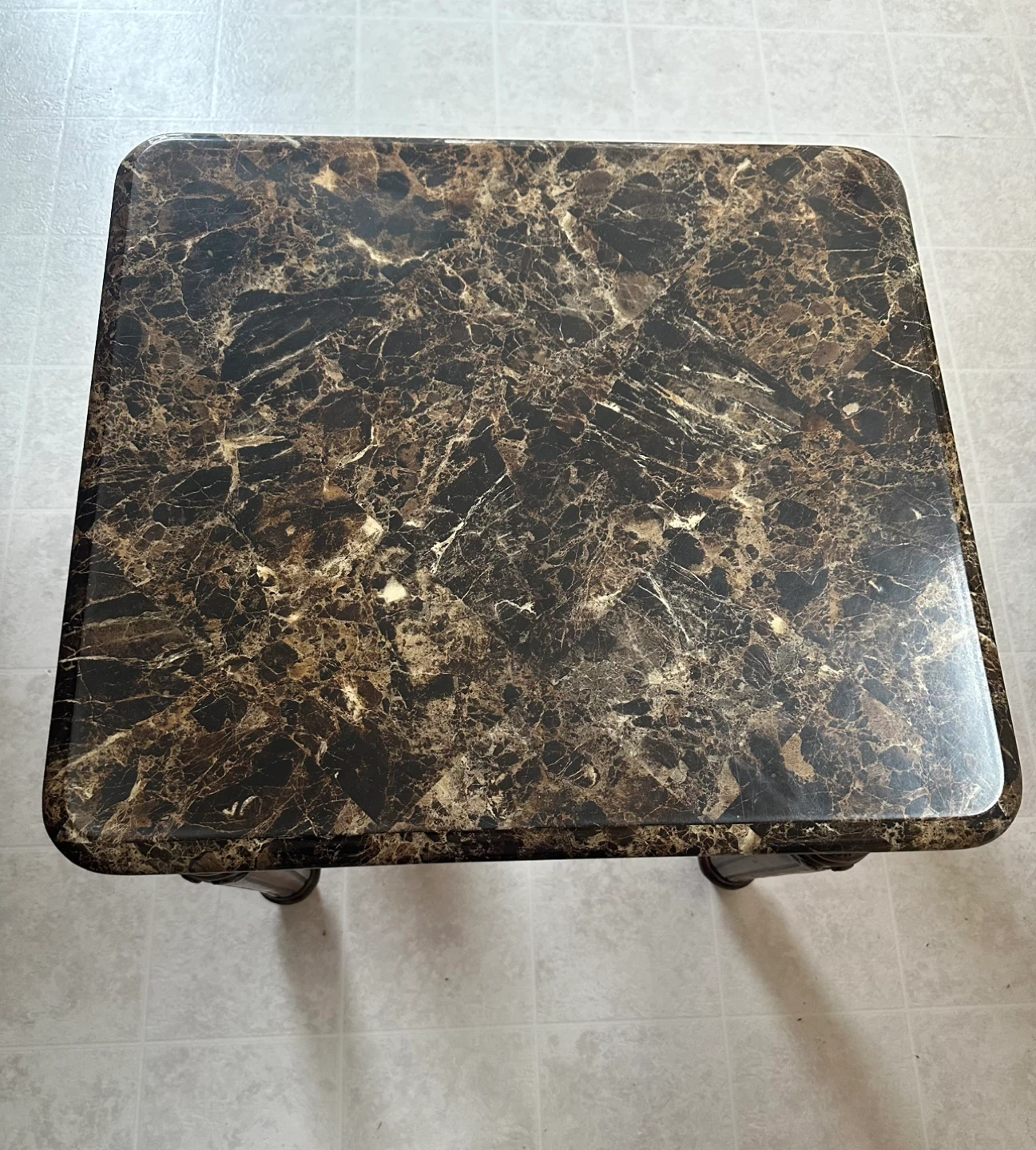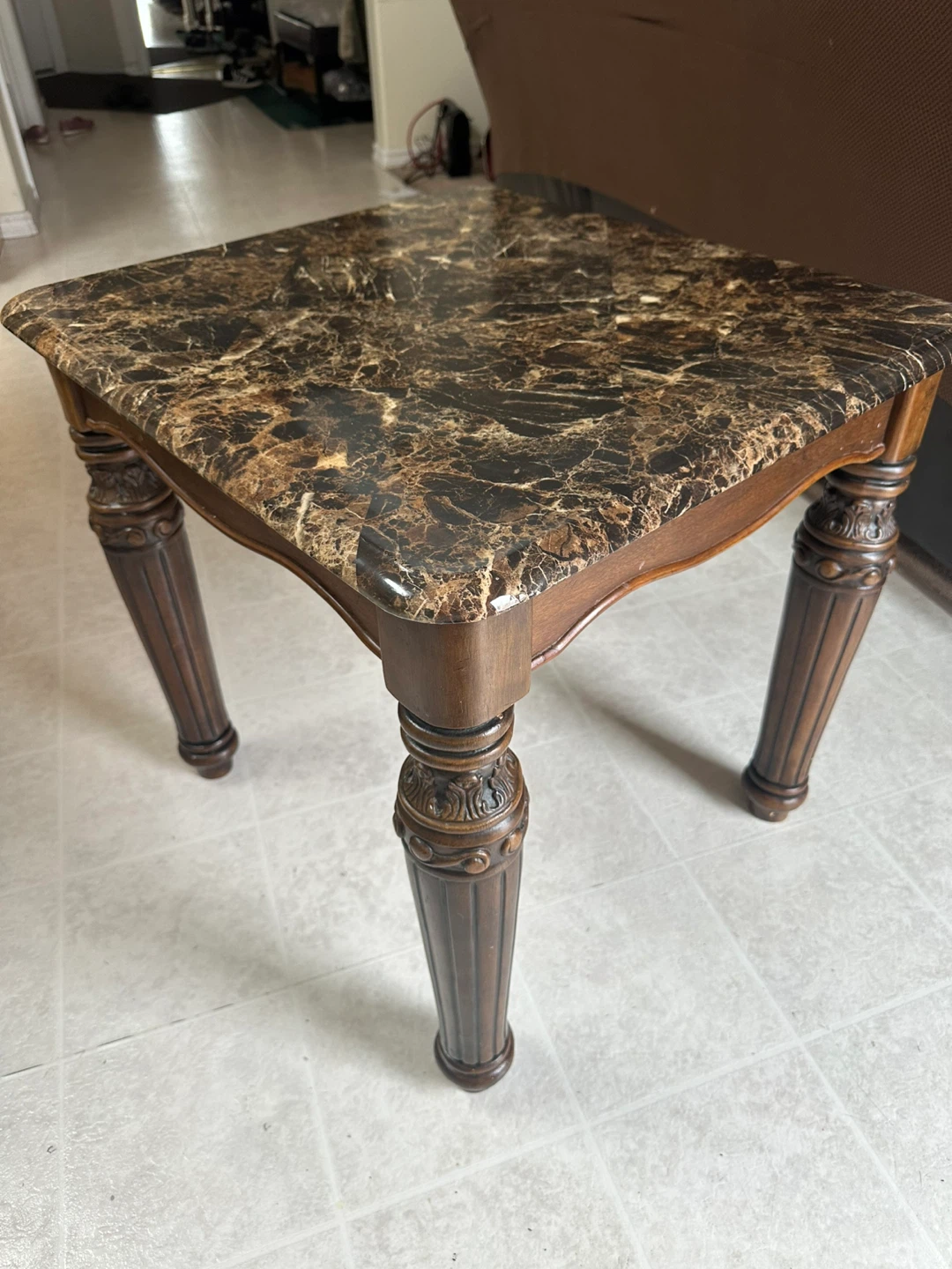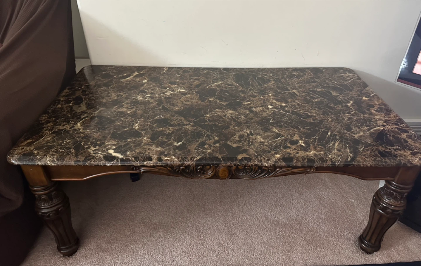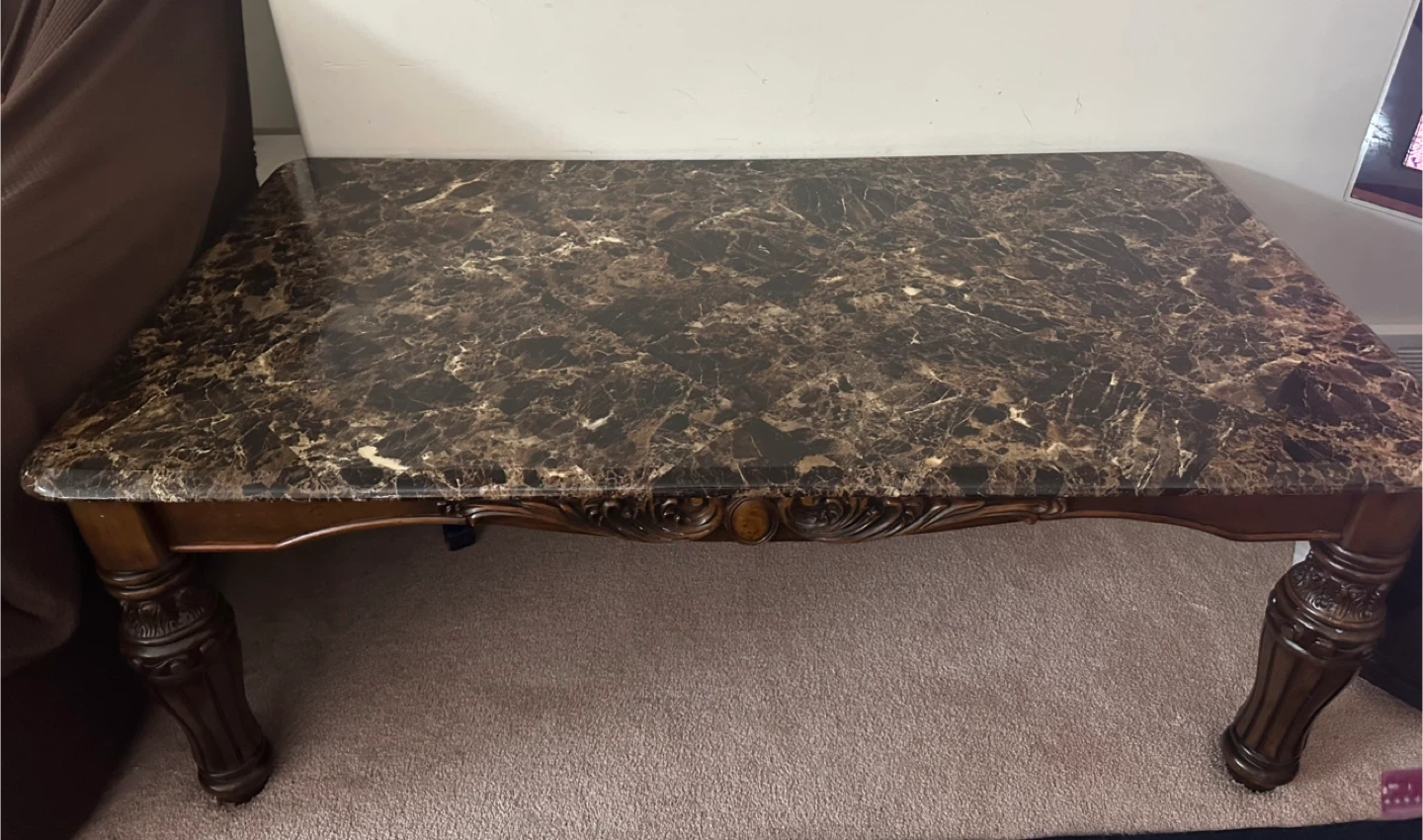 Features a dark marble-style top with detailed solid wood carved legs. Very sturdy and in great condition. Adds a classy, elegant look to any living room.