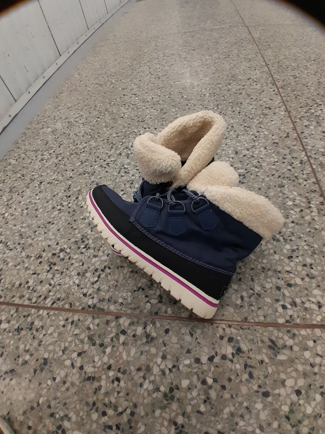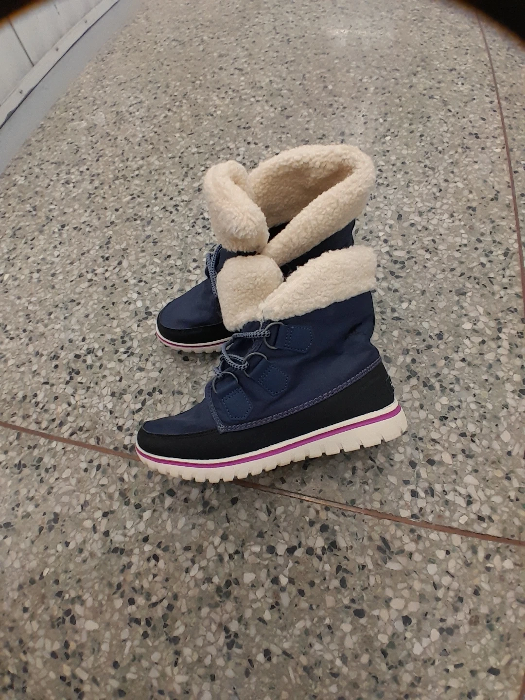 These Sorel winter boots are navy blue with a cozy white fleece lining. They feature a durable rubber sole with a pop of pink detailing along the midsole. Lace-up closure for a secure fit. Perfect for keeping little feet warm and dry during the colder months! Women's size 7