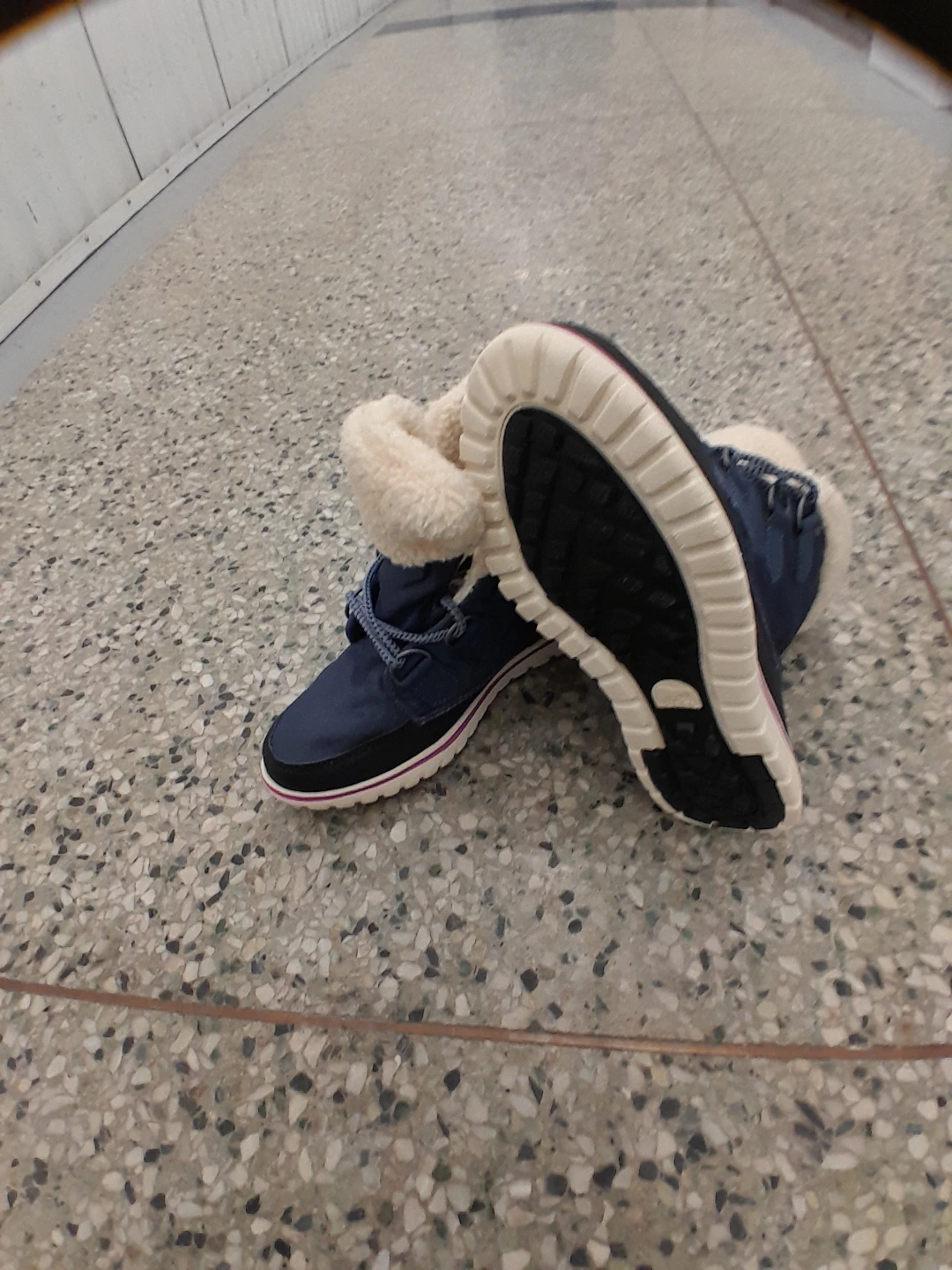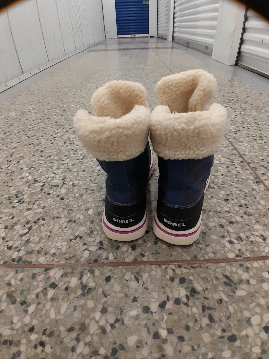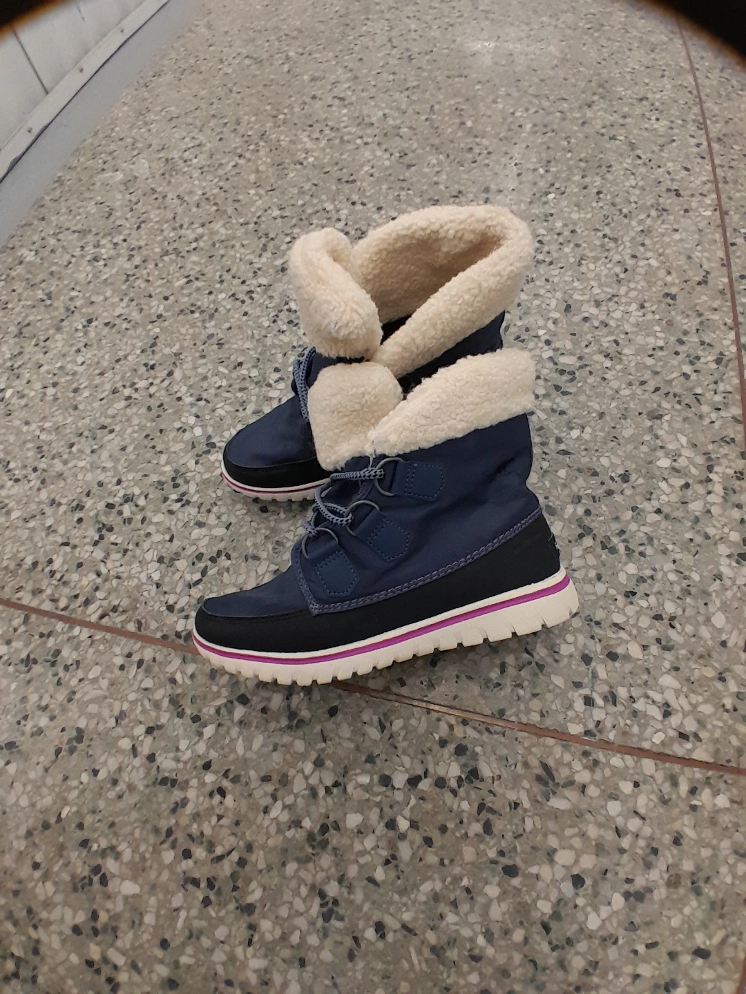 These Sorel winter boots are navy blue with a cozy white fleece lining. They feature a durable rubber sole with a pop of pink detailing along the midsole. Lace-up closure for a secure fit. Perfect for keeping little feet warm and dry during the colder months! Women's size 7