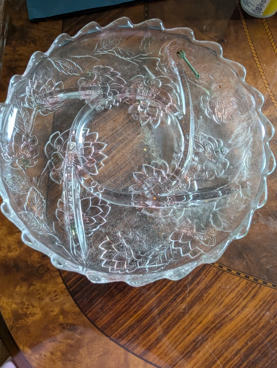 Clear glass divided serving platter with floral embossed design. It's a round dish with scalloped edges. This tray is perfect for serving appetizers or desserts!