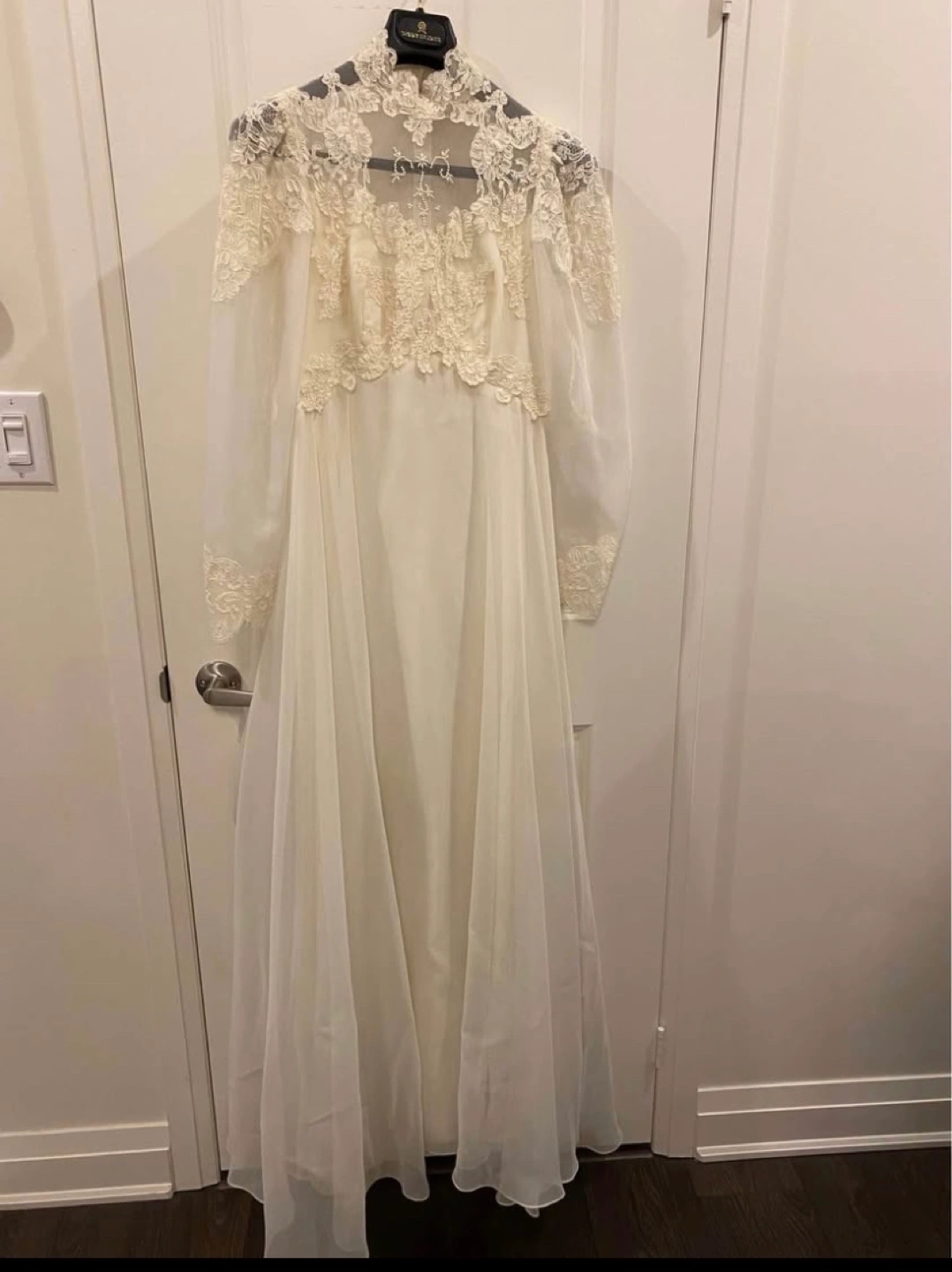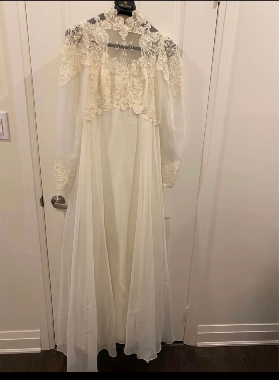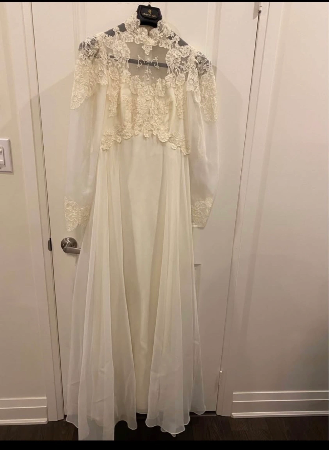 Stunning vintage wedding dress. Long sleeves, high neck, and intricate lace detailing. A-line silhouette. Flowing chiffon skirt. Elegant and timeless.