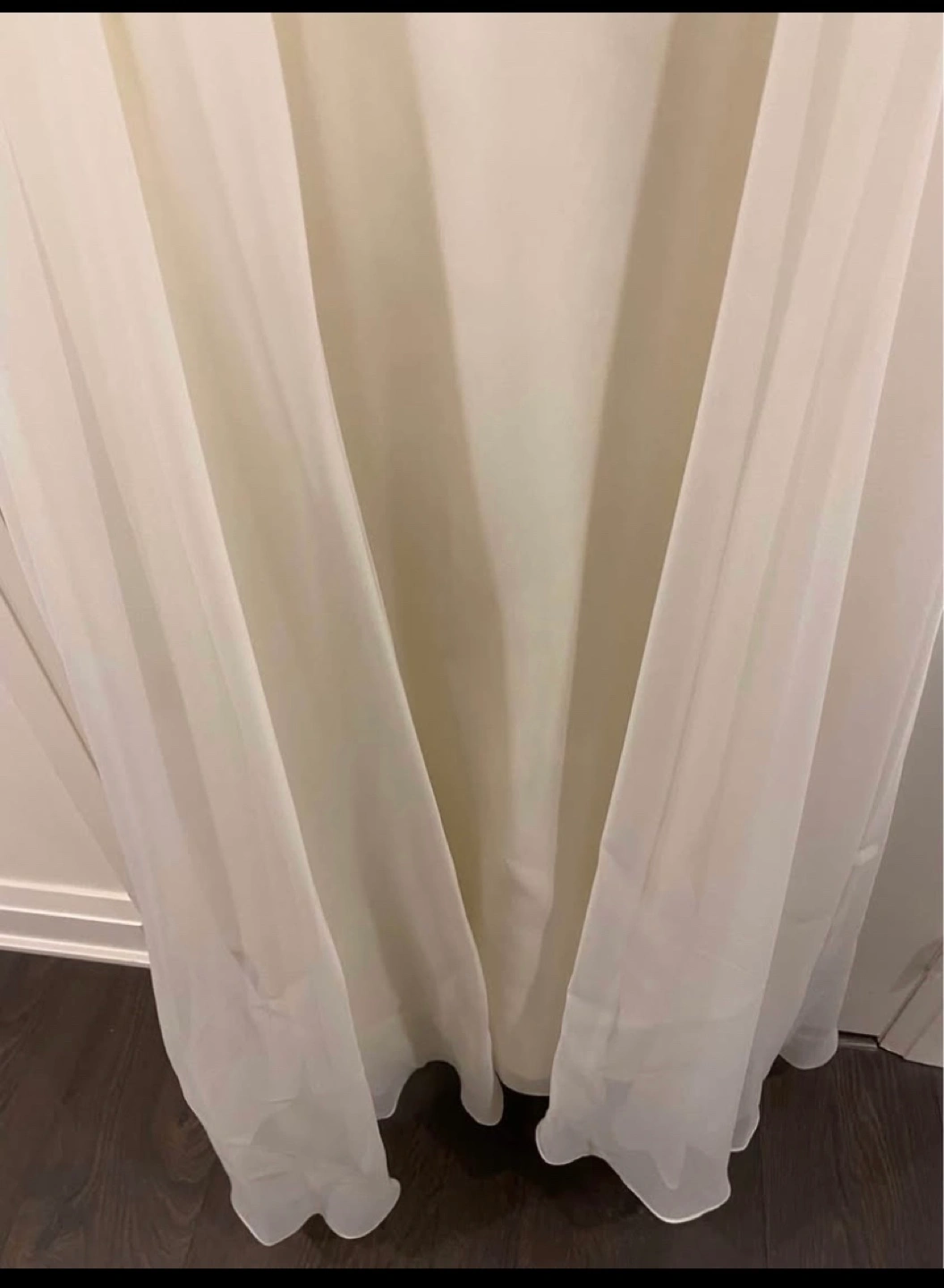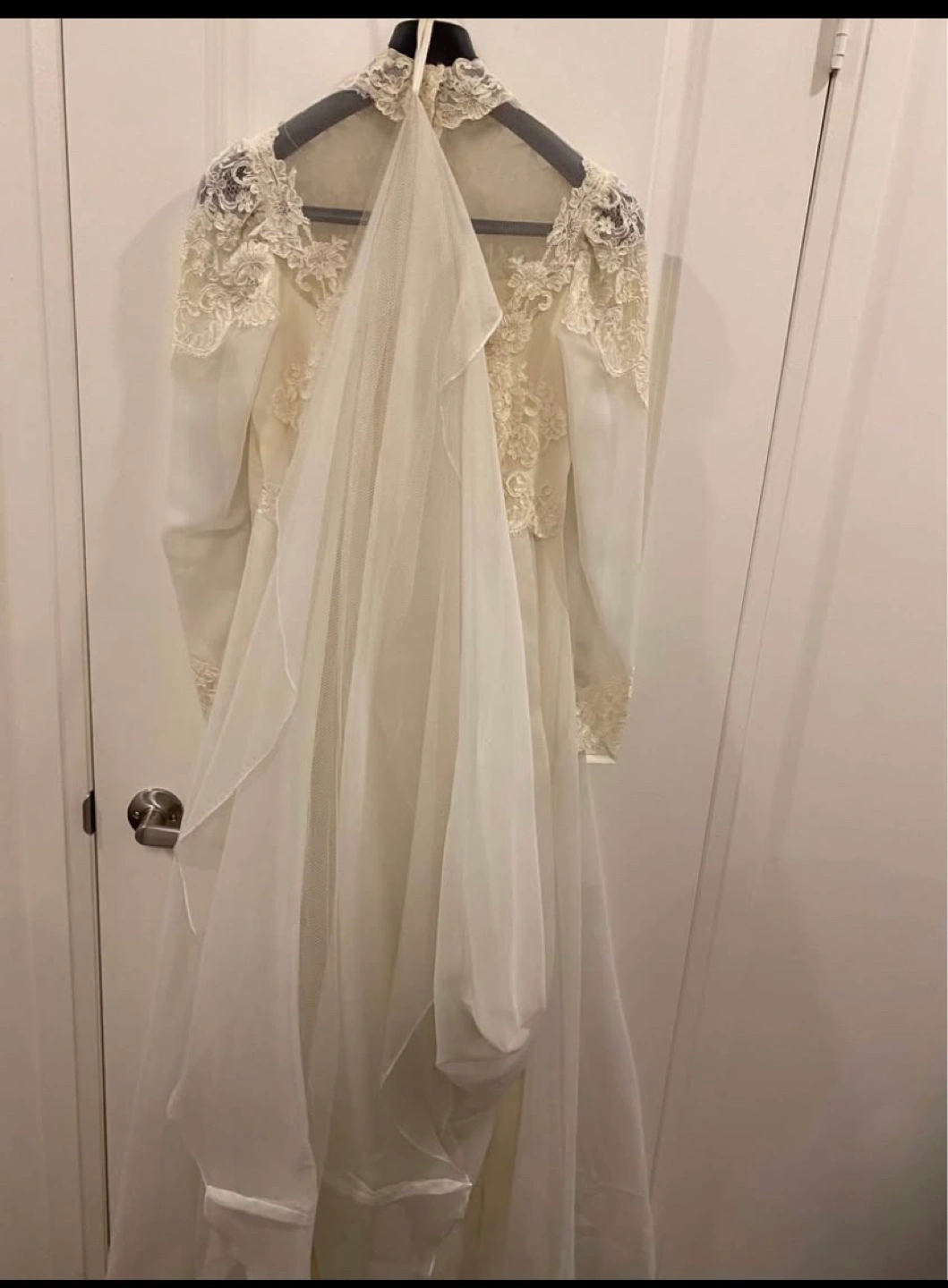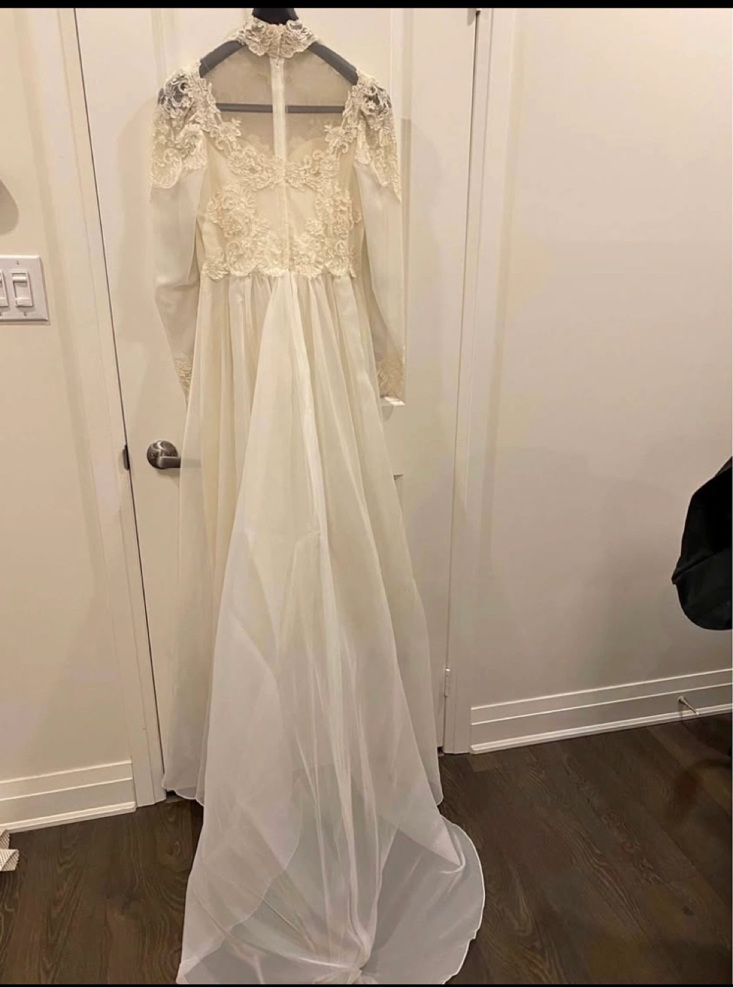 Stunning vintage wedding dress. Long sleeves, high neck, and intricate lace detailing. A-line silhouette. Flowing chiffon skirt. Elegant and timeless.