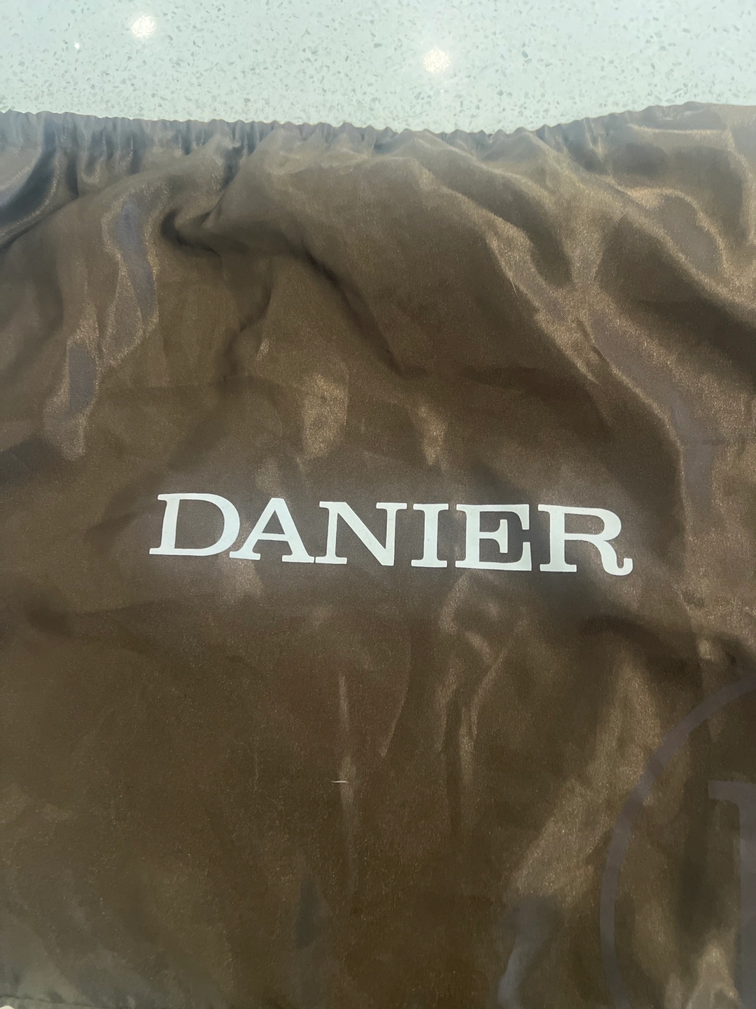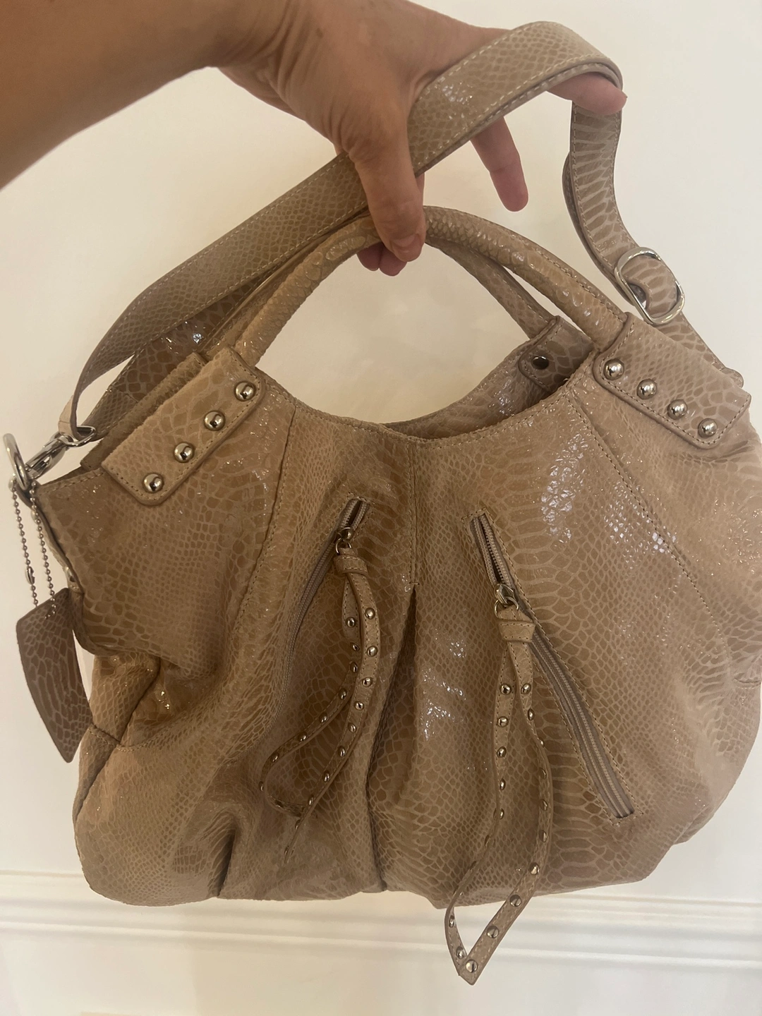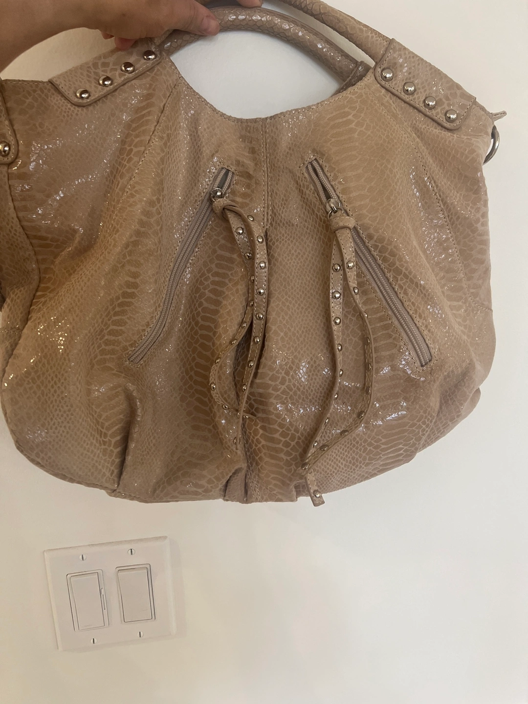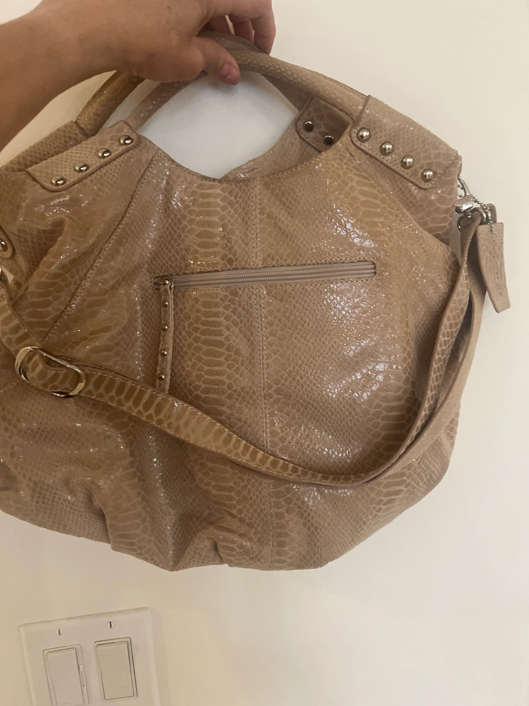 This bag has a top zipper closure, a zip pocket on the back, and a long shoulder strap. It also has two short straps on the top and studs on the front and sides of the bag. This bag is brand new, never been used