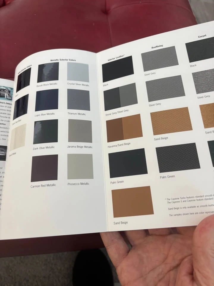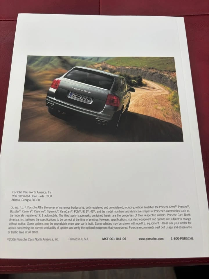 Original Porsche Cayenne marketing material covering all engines and models. Includes 2004 interior/exterior colors and a breakdown of various components. A must for a Porsche enthusiast or owner.