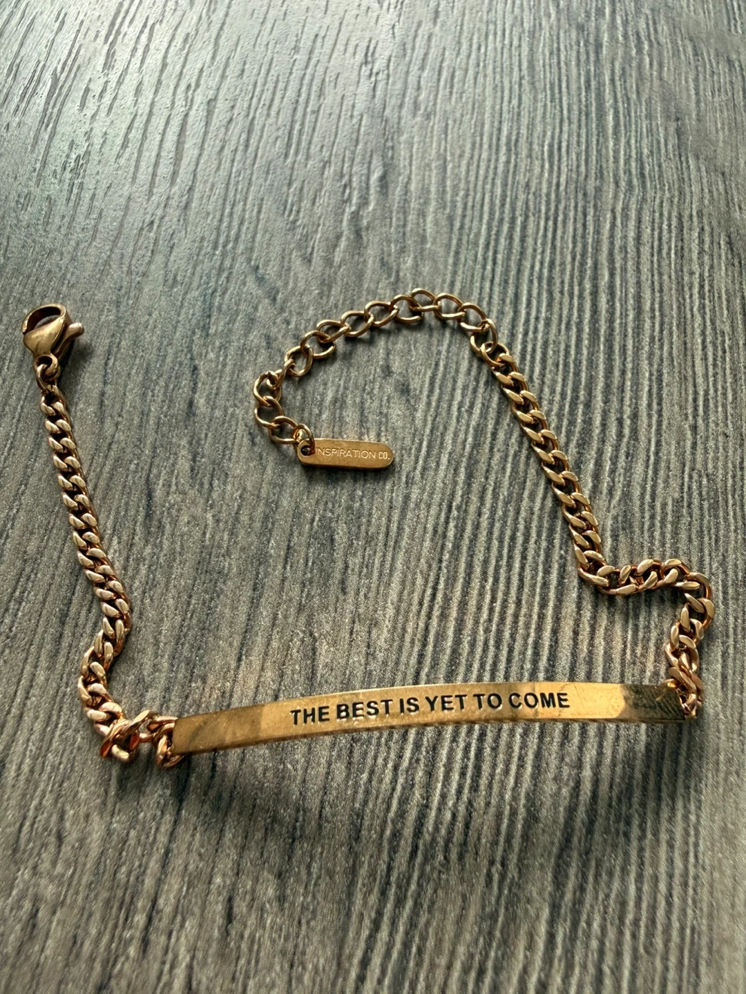 This rose gold tone bracelet from Inspiration Co. features the engraved phrase "The Best Is Yet To Come".