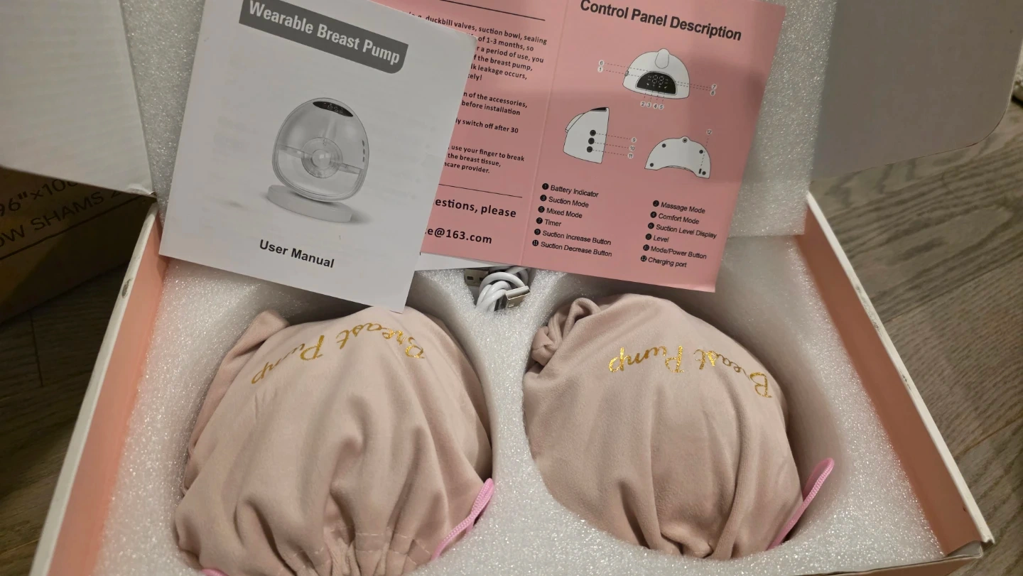 This Lulua wearable breast pump comes with two pumps, each in its own storage bag. The package includes a user manual and control panel instructions. Multiple modes are available, including massage and comfort. Brand New