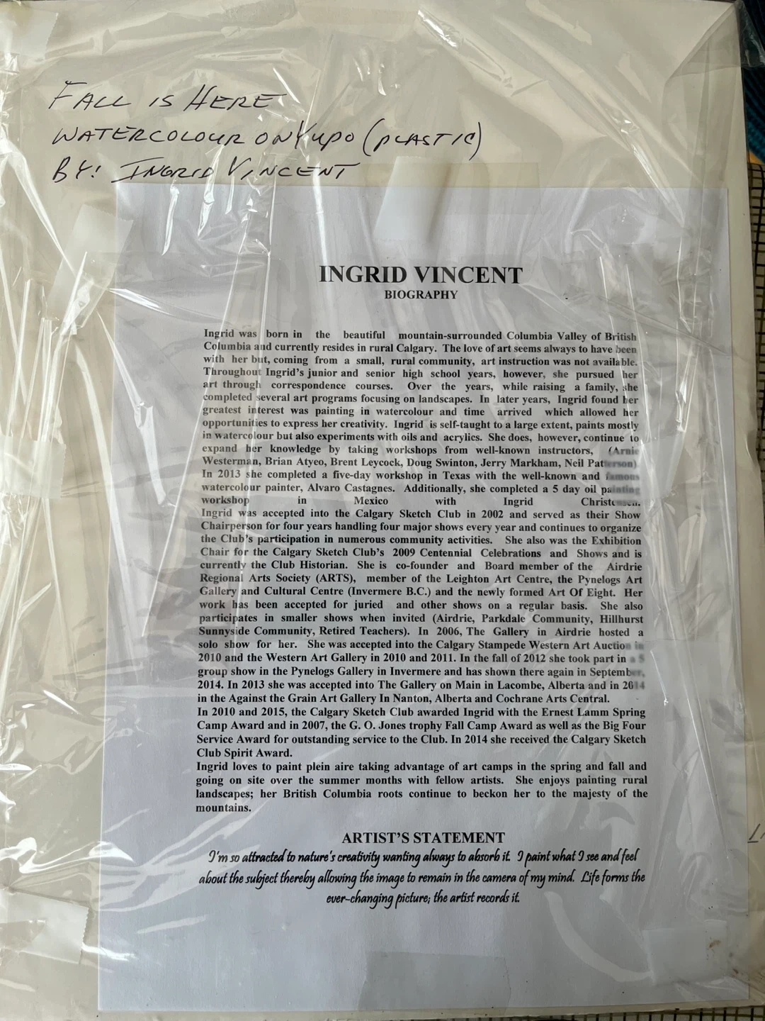 “Fall is Here”, watercolour on Yupo by Ingrid Vincent, 6x9. The artwork is matted to 11x14 inches. It’s probably an “en plein aire” piece, as Ingrid loves to paint outdoors whenever she gets the chance.