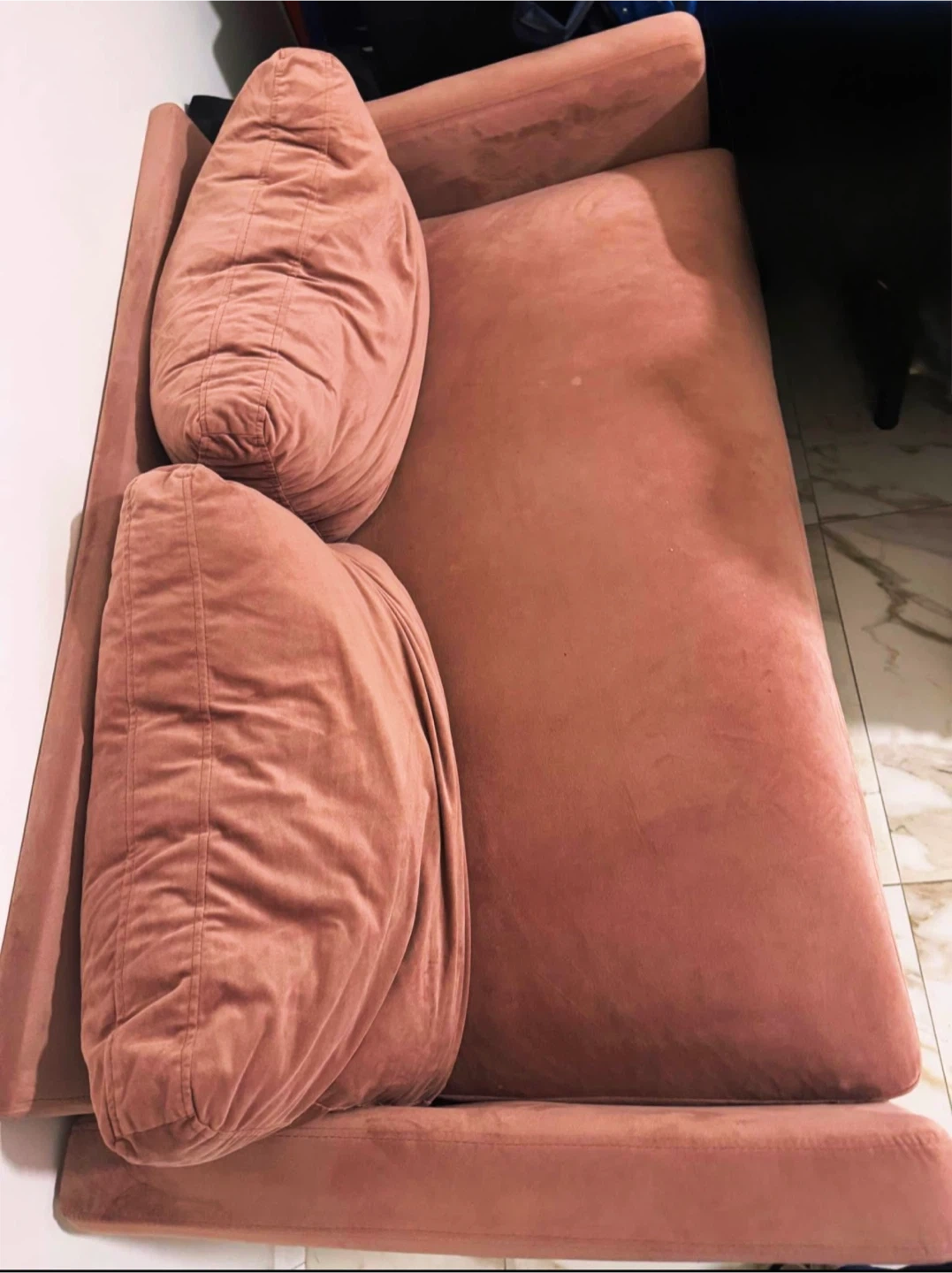 Two-seater loveseat sofa upholstered in soft pink velvet fabric. Features plush back cushions and a comfortable seating area. This compact sofa is perfect for smaller living spaces.
