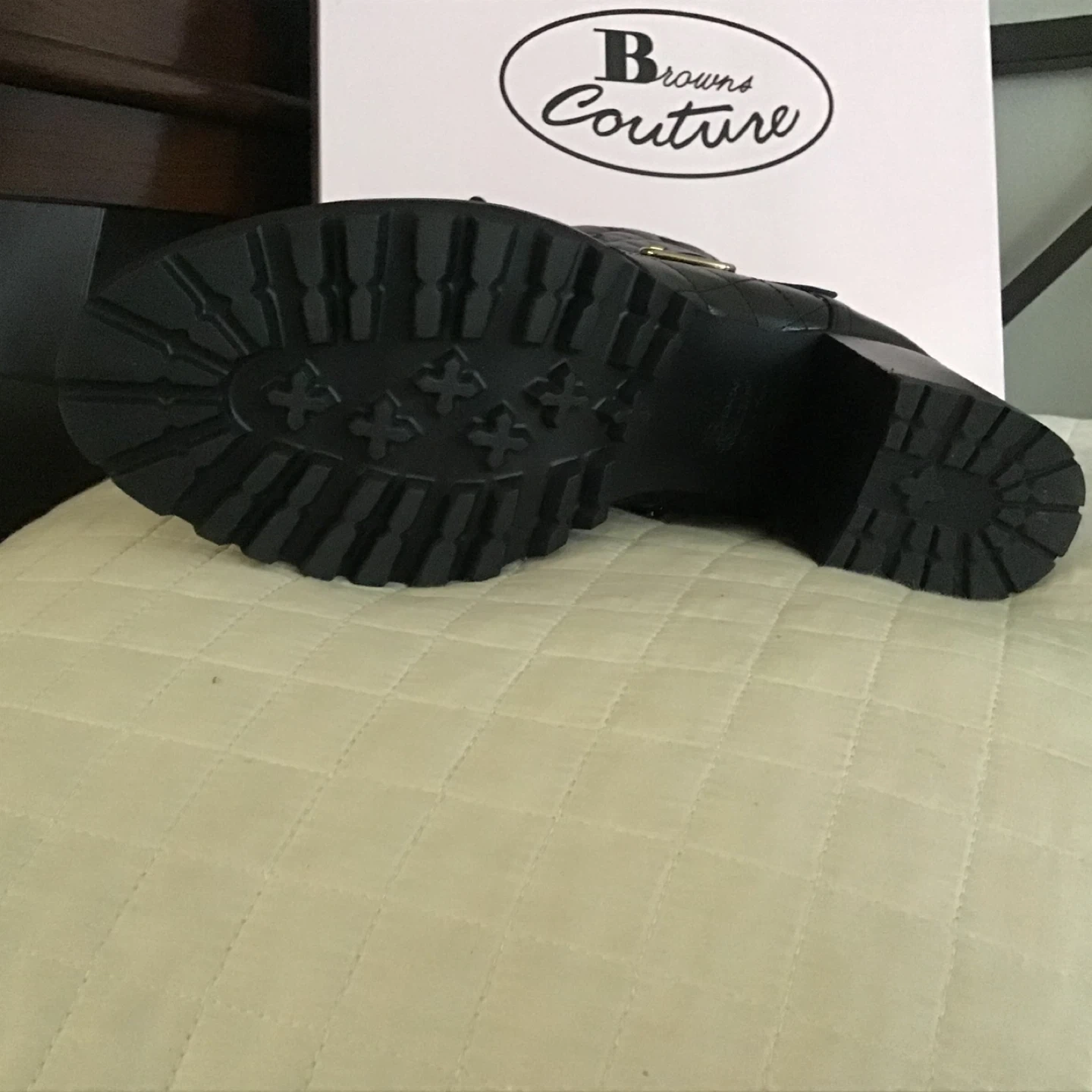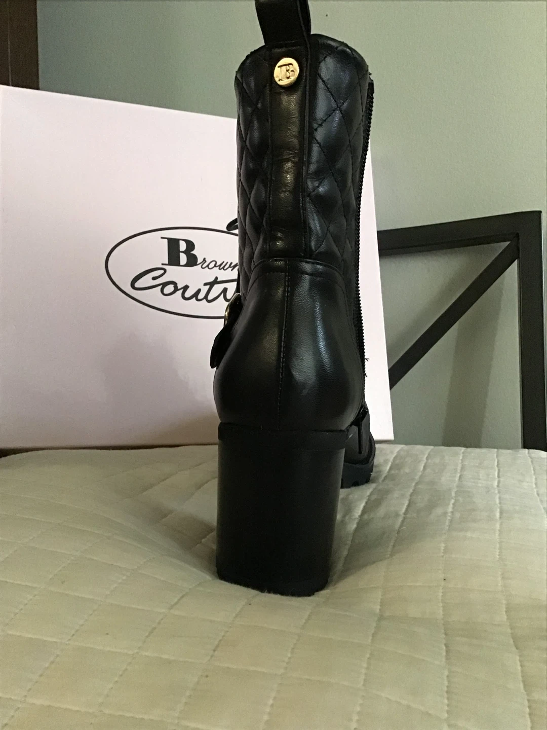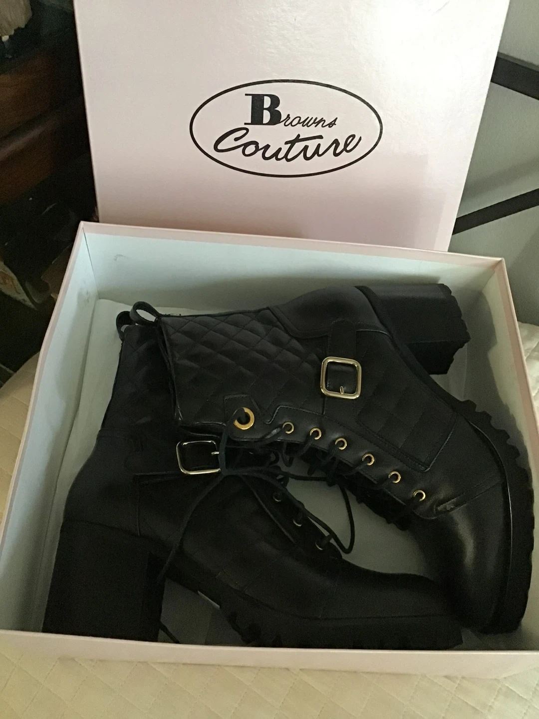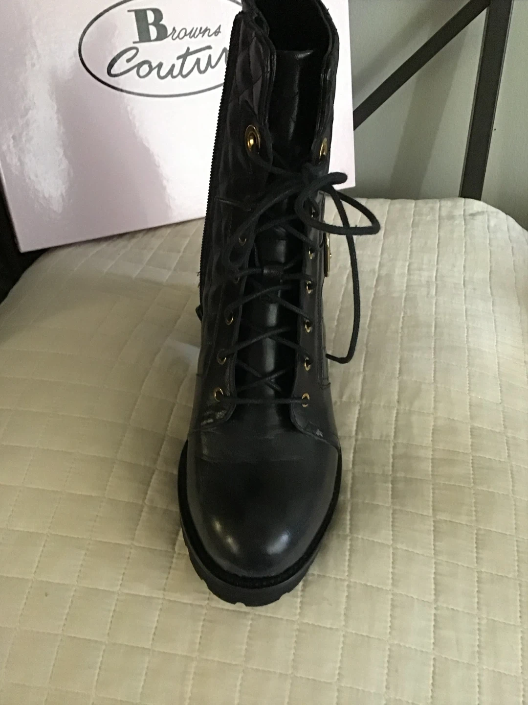 These Browns Couture boots feature a black quilted design with lace-up and side zip closures. They have a stylish block heel and durable lug sole. The boots come in their original box. Retails for $398.00