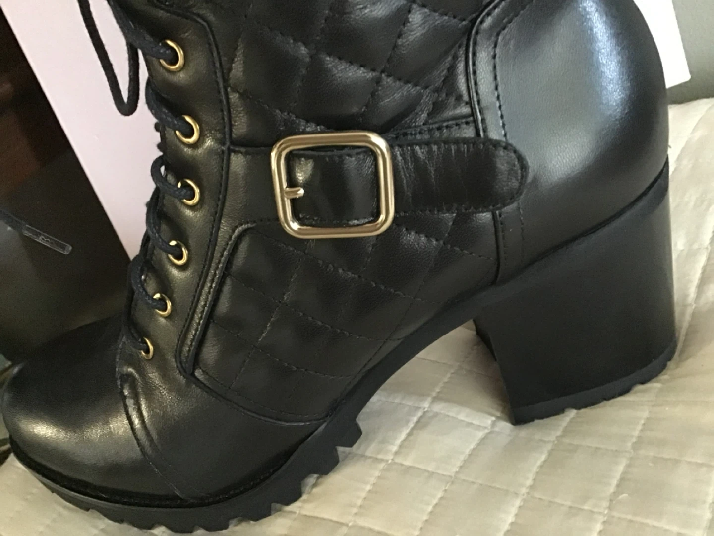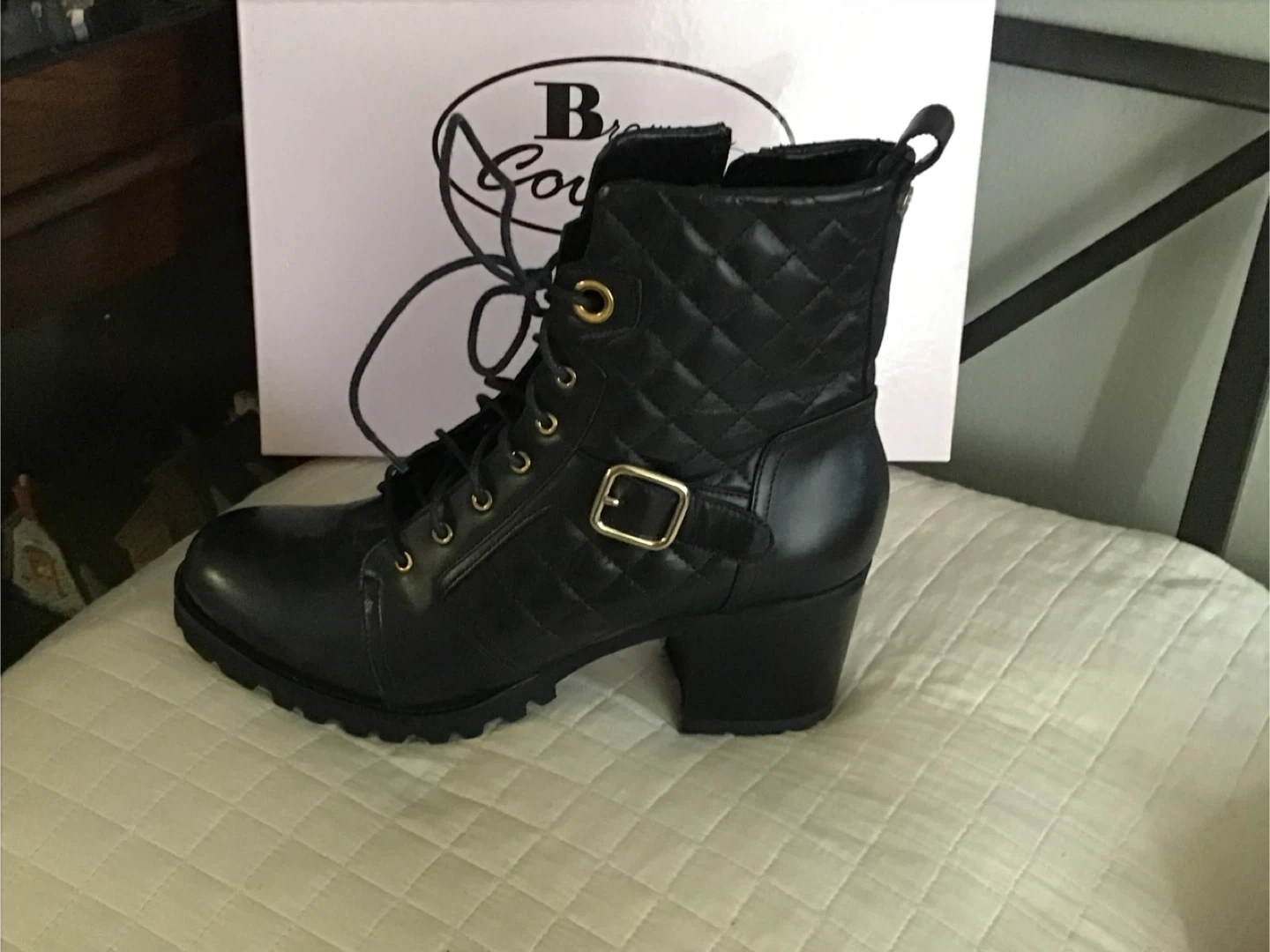 These Browns Couture boots feature a black quilted design with lace-up and side zip closures. They have a stylish block heel and durable lug sole. The boots come in their original box. Retails for $398.00