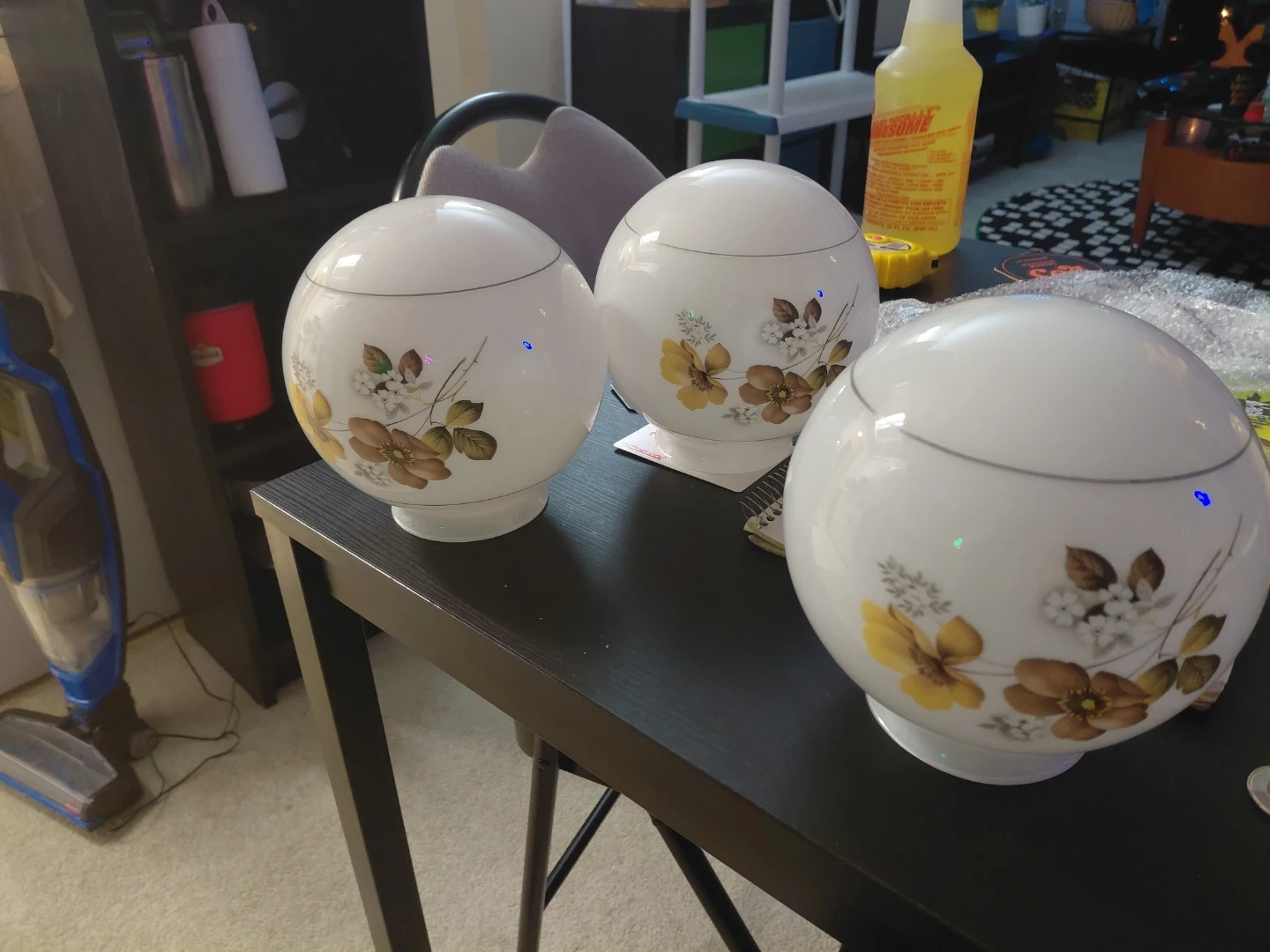 vintage Mid-Century Modern (MCM) white milk glass light globes featuring a floral decal design, commonly produced during the 1960s or 1970s.