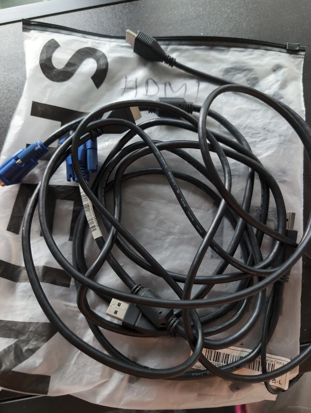 Bundle of black cables including an HDMI cable and a VGA cable with USB connector. $3 each