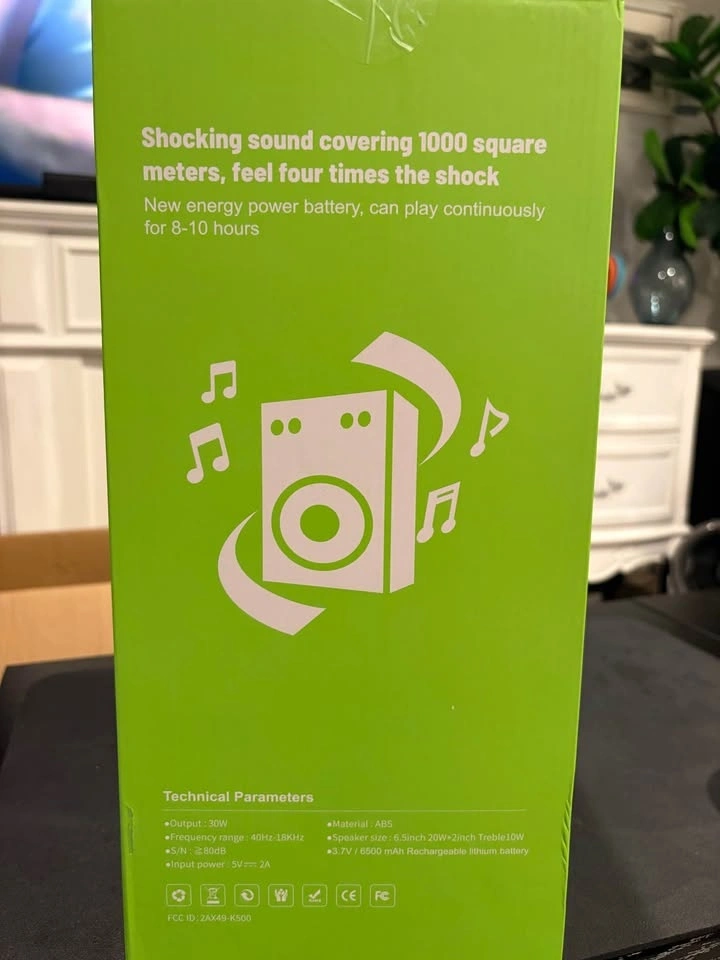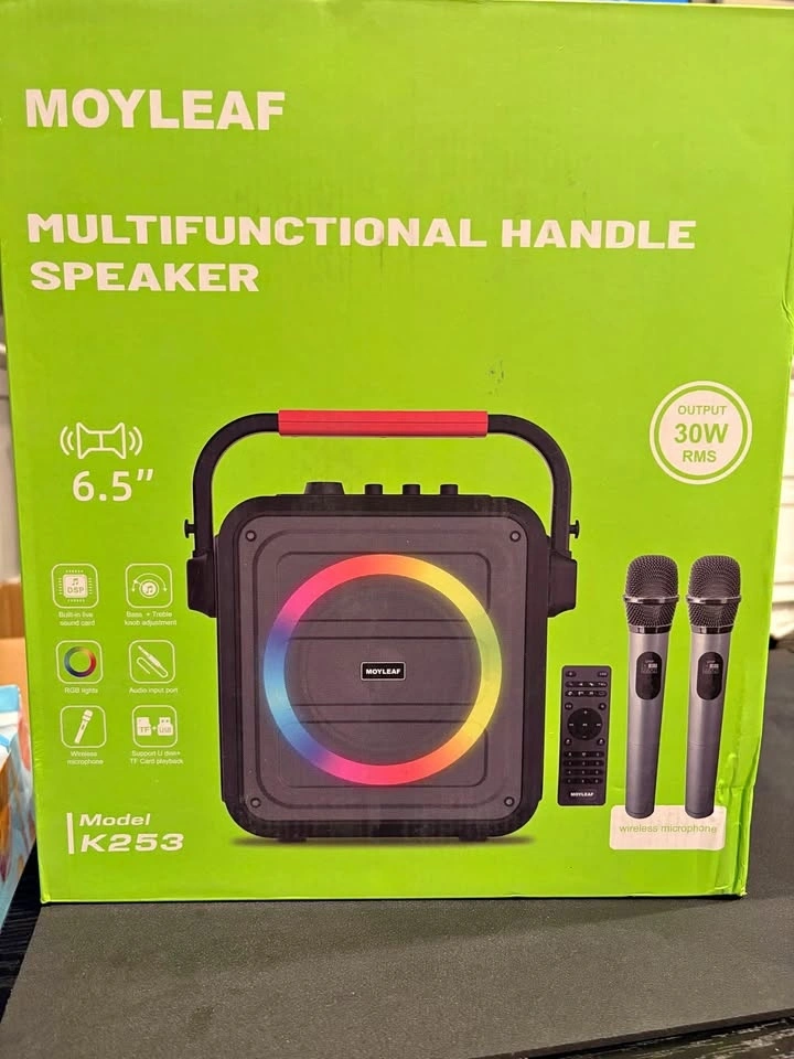 All-in-One Karaoke Set with Bluetooth 5.3, USB, and AUX. Functions as a music player, karaoke speaker, PA system, and guitar amplifier. Includes 2 wireless microphones. Features a professional high-fidelity audio system with 6.5-inch woofers for clear vocals and immersive sound. Adjust reverb with the ECHO button. Built-in LED light show syncs with music. Portable with a leather handle and shoulder strap. Playtime is 4-8 hours on a full charge. Supports TWS mode for connecting two speakers. Please charge for 3-6 hours for the first use. This item does not come with a screen, and each microphone requires 2 AA batteries (not included).