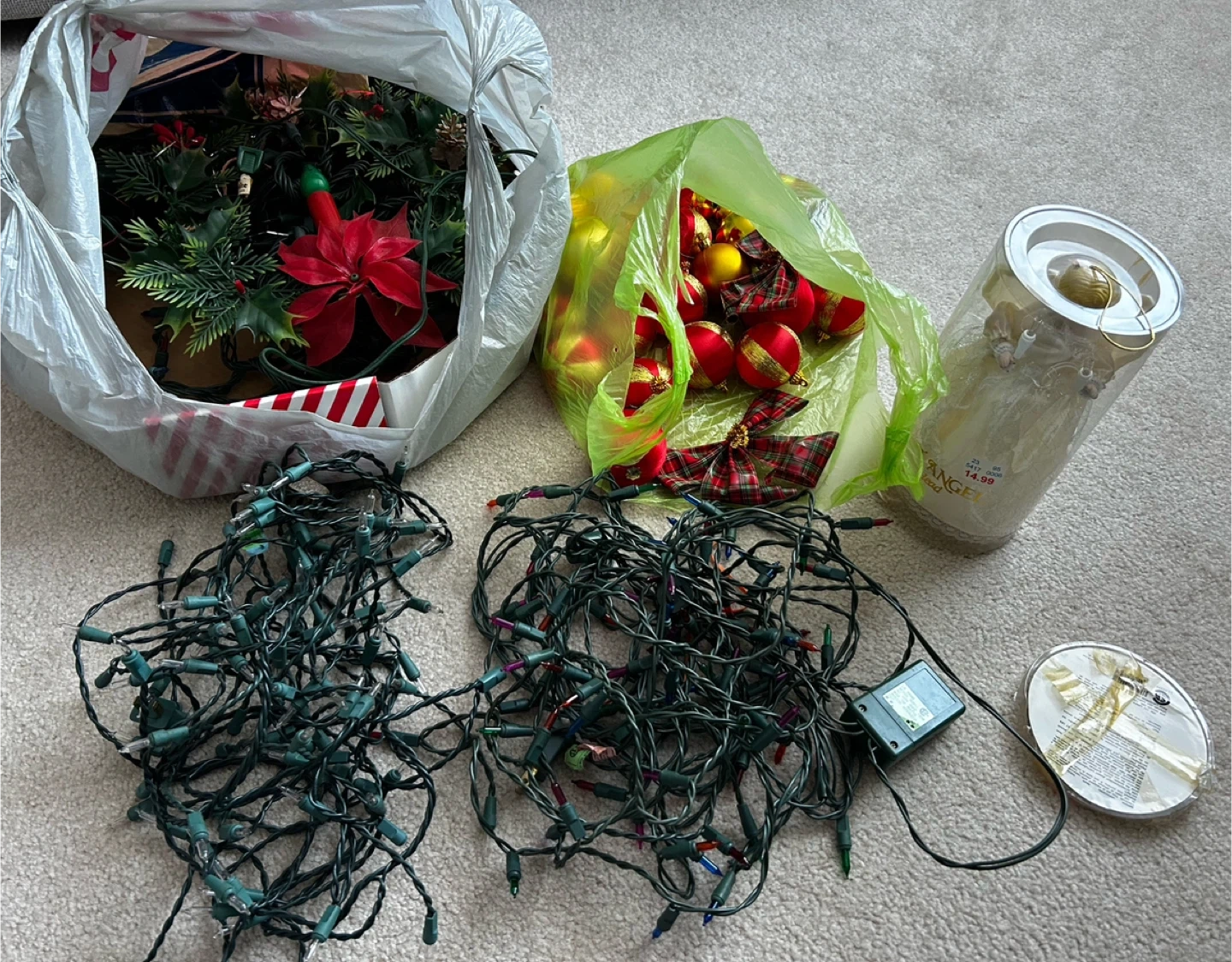 This bundle includes two sets of Christmas lights, Christmas wreath (need a fix or a new bulb), a bag of random ornaments and angel tree topper.