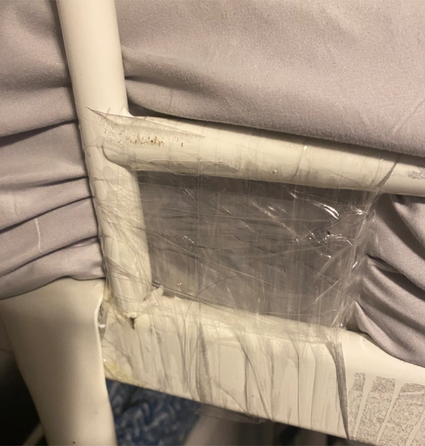 This is a sturdy white metal bunk bed, perfect for saving space in kids' rooms or guest bedrooms. The frame is made of durable metal. There is a defective weld point as shown in the photos, but the bed is still functional/being.