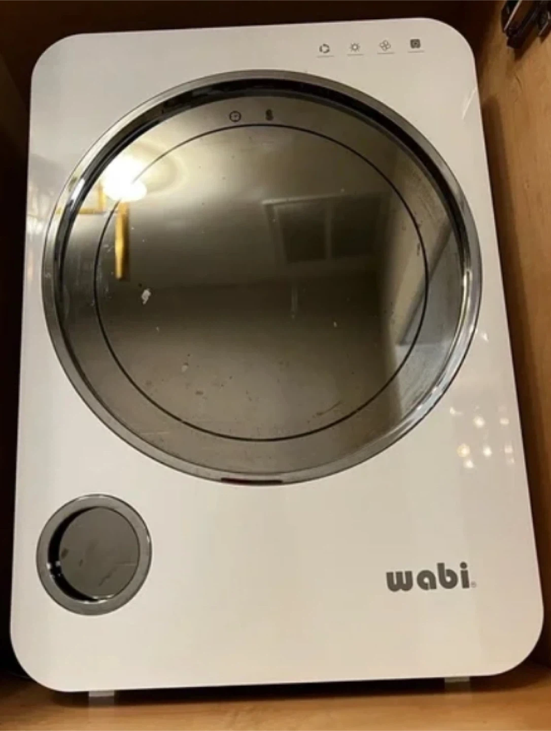 This is a Wabi compact dryer. It's white and has a round door. It has a small circular compartment on the lower left.