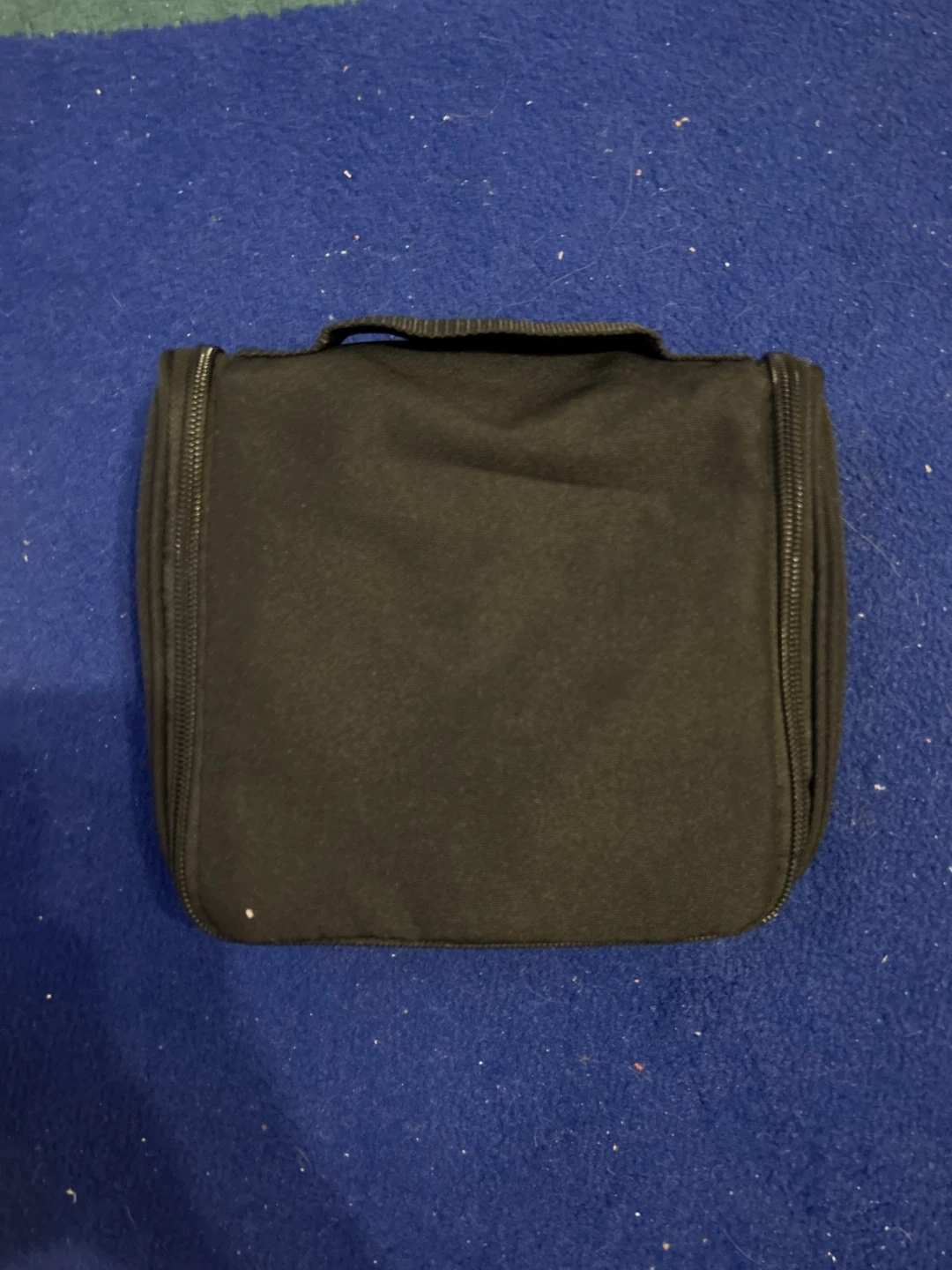 This is a handy black hanging toiletry bag. It has multiple compartments to keep your toiletries organized while travelling or at home. It is in great condition and ready for your next trip.