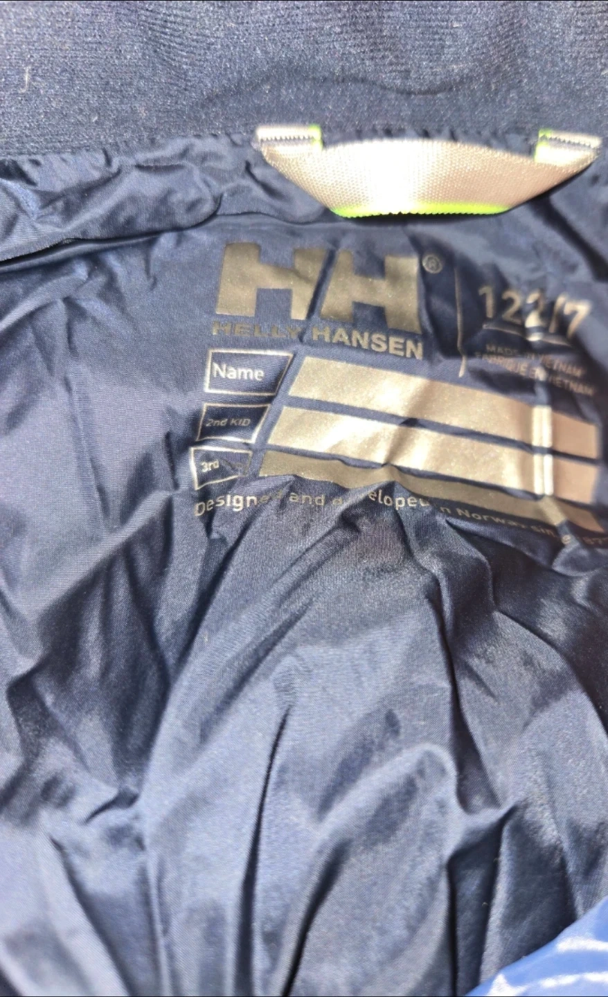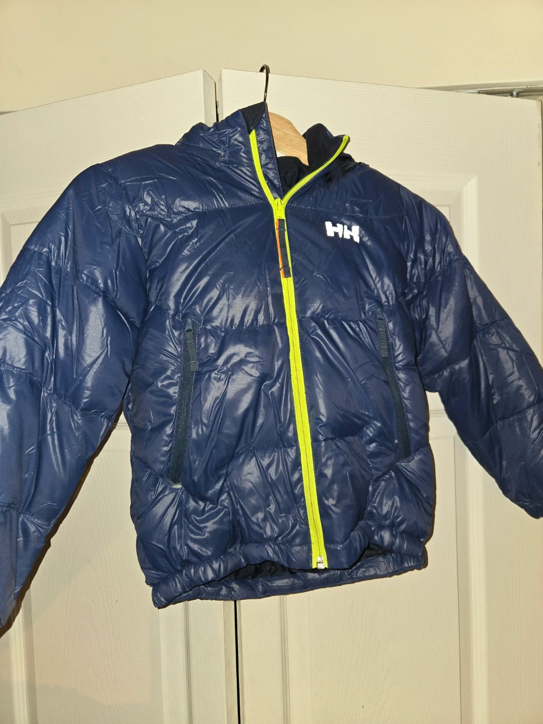 I'm selling a Helly Hansen puffer jacket in size 122/7. It's a stylish and warm jacket, perfect for keeping your little one cozy during the colder months. The jacket features a vibrant yellow zipper that adds a pop of colour to the navy blue exterior. It's in great condition and ready for a new owner!