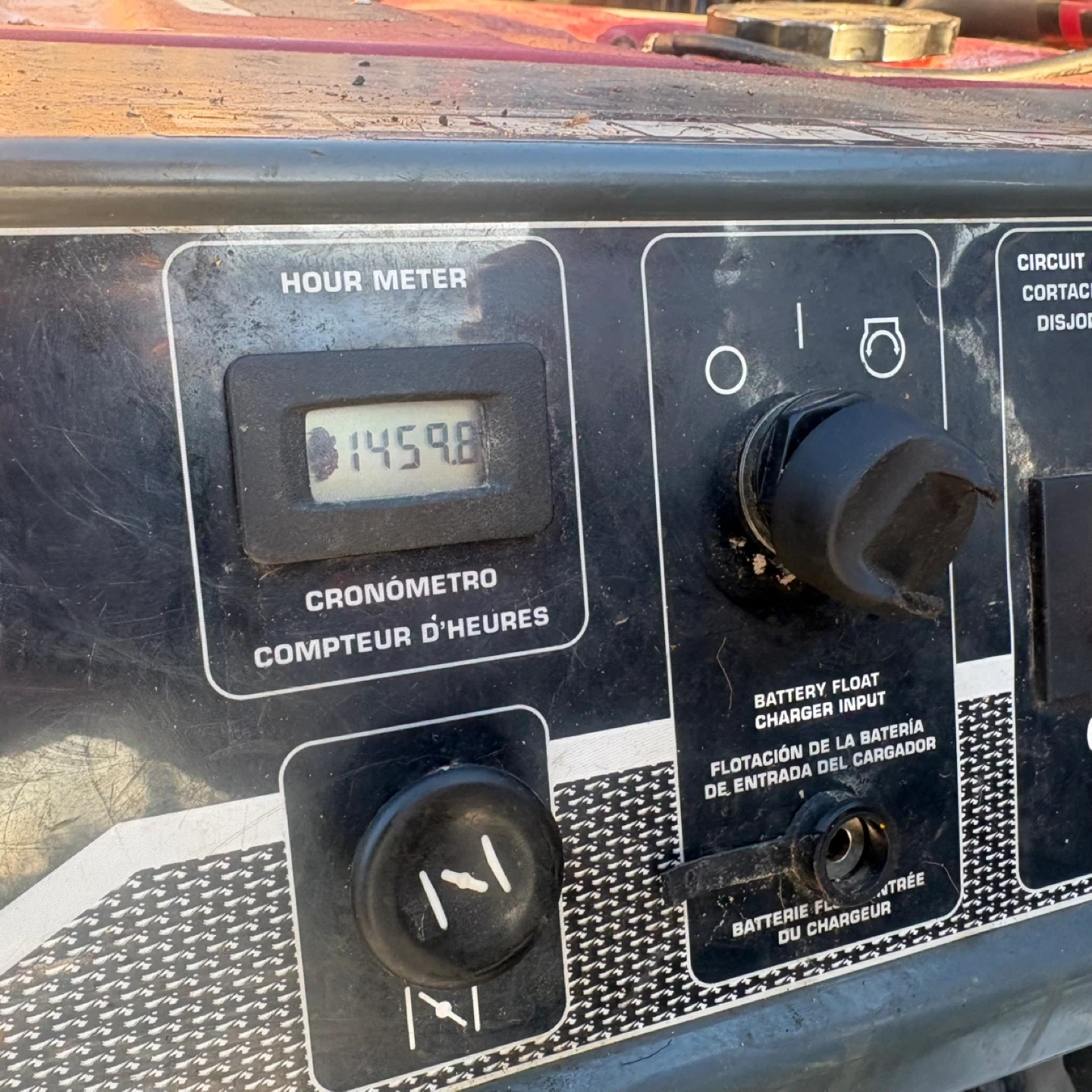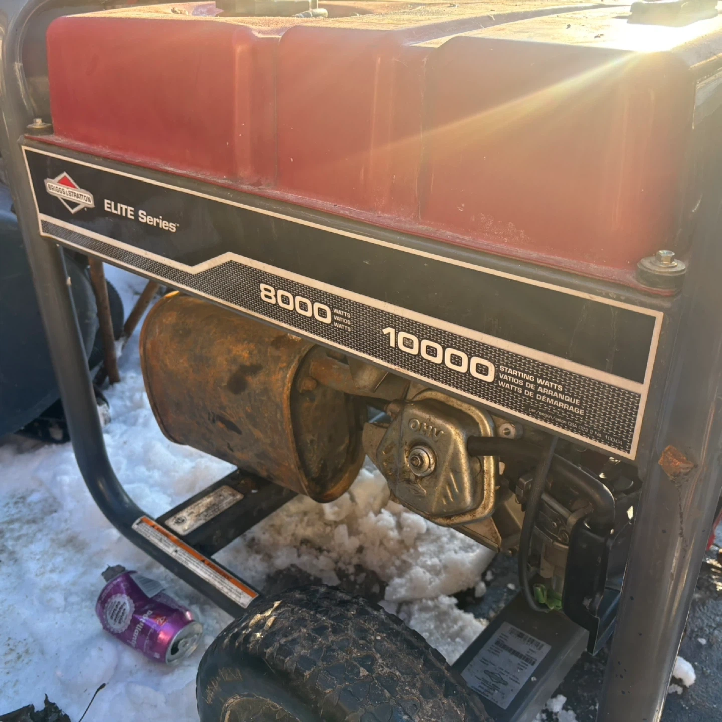This is a Briggs & Stratton Elite Series generator. It has a 10000 starting watt capacity and 8000 running watts. The hour meter shows 1459.8 hours. It's suitable for power outages or job sites.