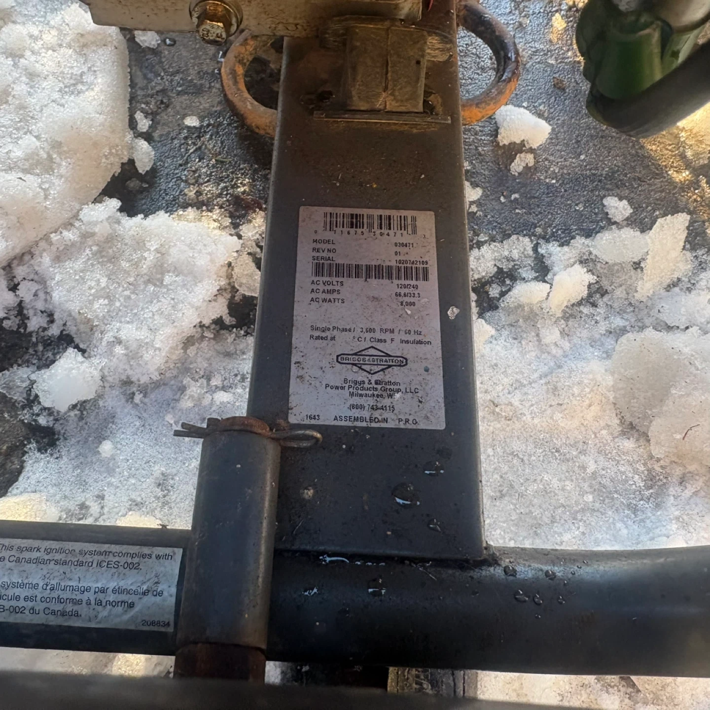 This is a Briggs & Stratton Elite Series generator. It has a 10000 starting watt capacity and 8000 running watts. The hour meter shows 1459.8 hours. It's suitable for power outages or job sites.