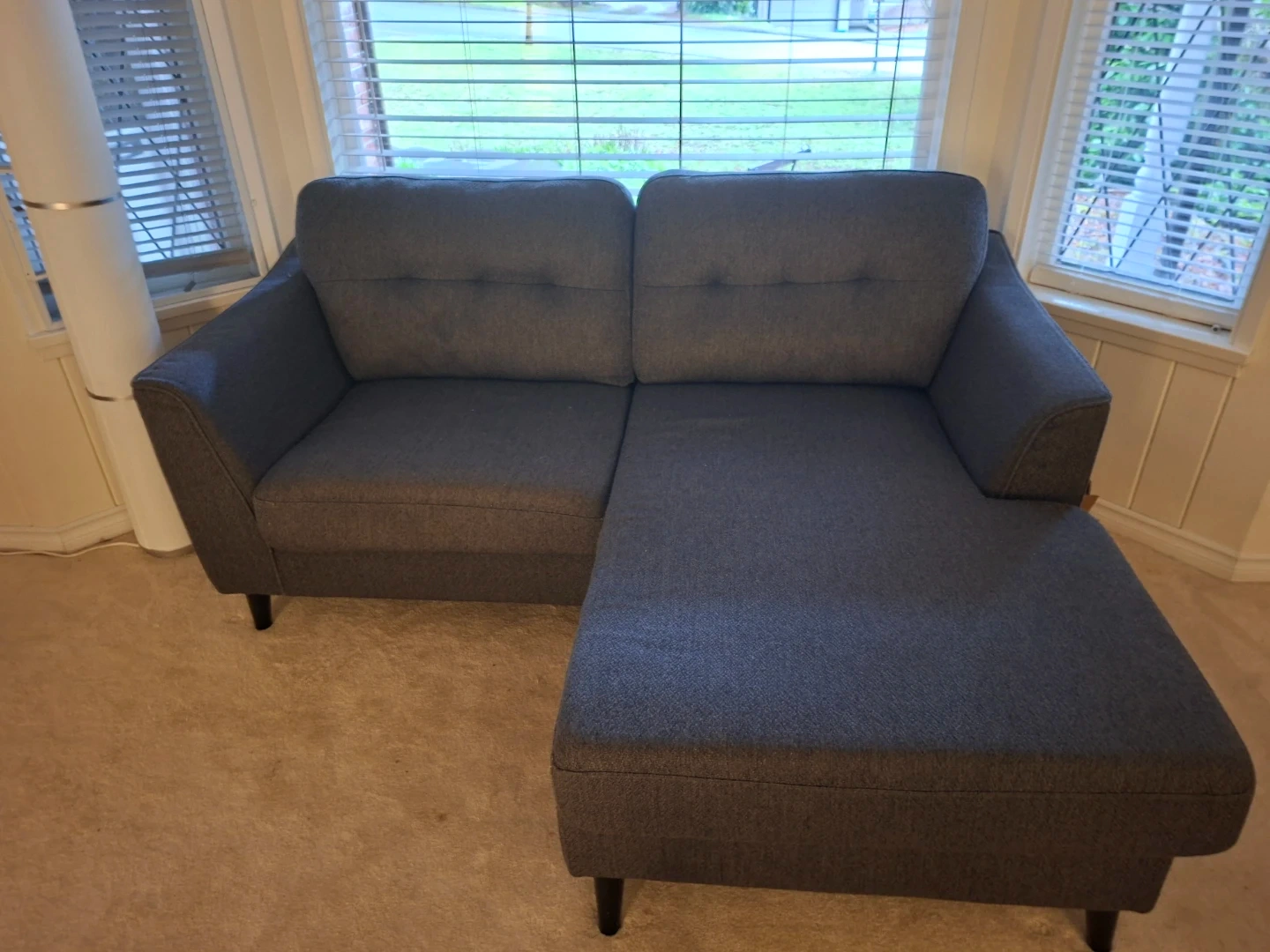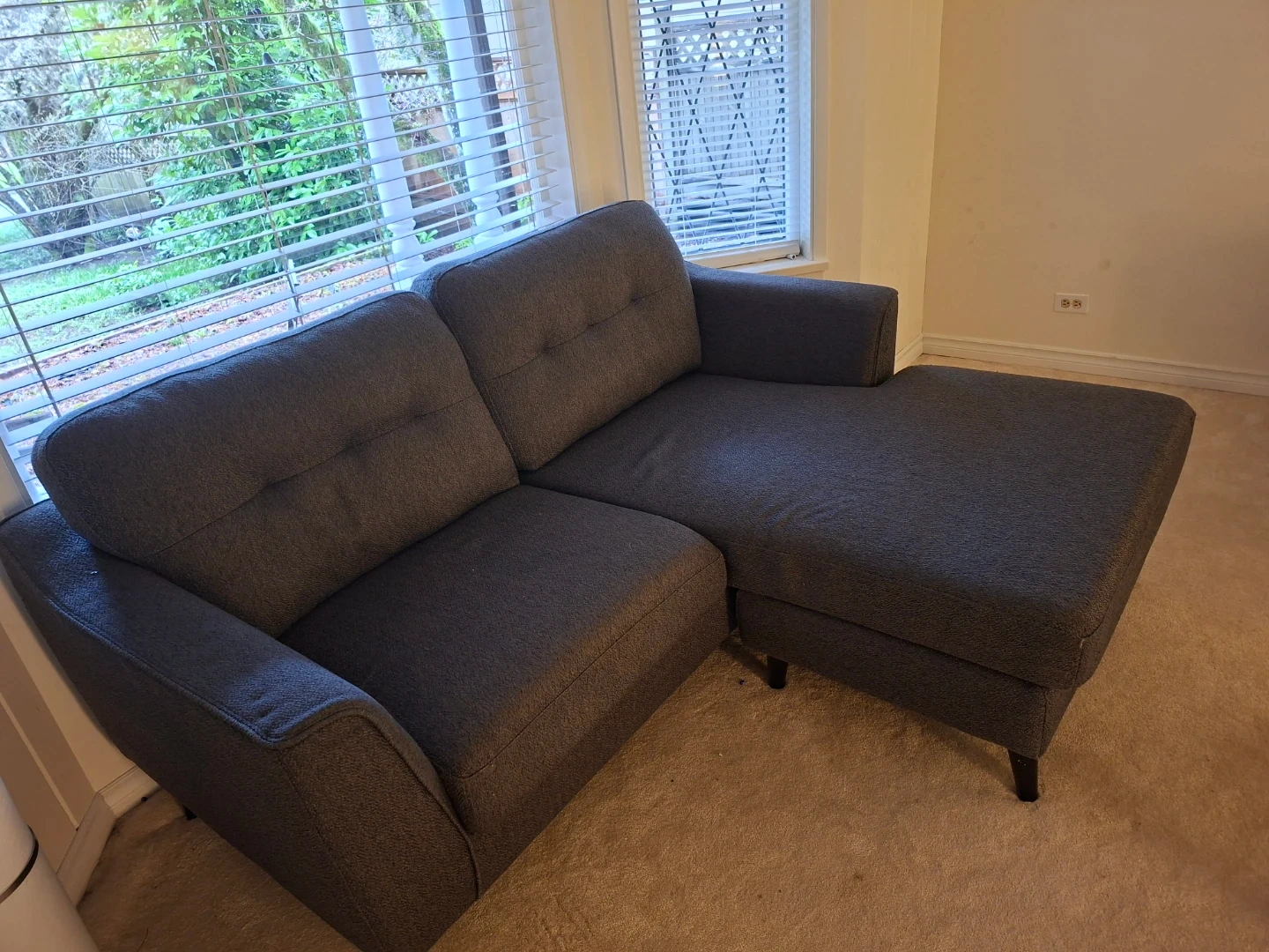 A modern grey sectional sofa featuring a chaise lounge. Upholstered in a durable fabric with button tufting on the back cushions. This piece offers flexible seating arrangement for most living spaces.