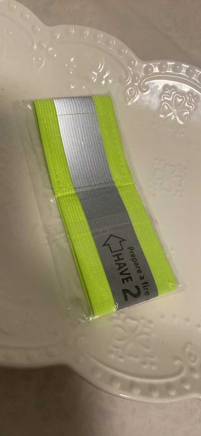 This elastic band is designed to help with safety planning. It features reflective stripes and text in both English and French, reminding you to "HAVE 2 WAYS OUT" and "AYEZ 2 SORTIES". It's a simple tool for escape plan exercises and fire preparedness. Elastic band with reflective detailing.