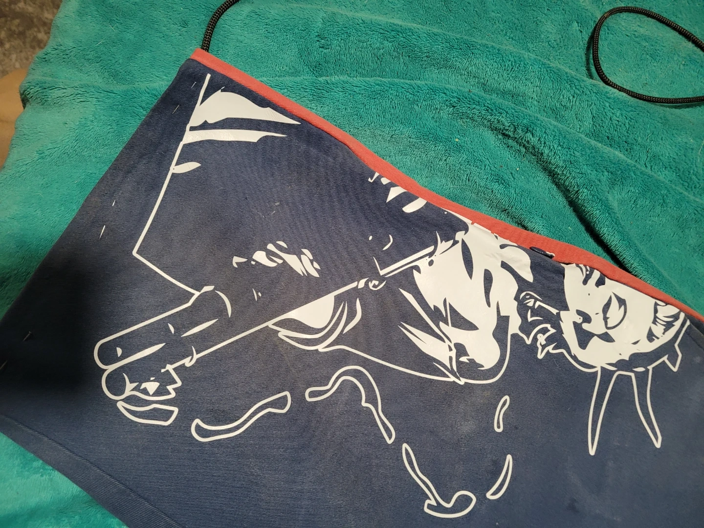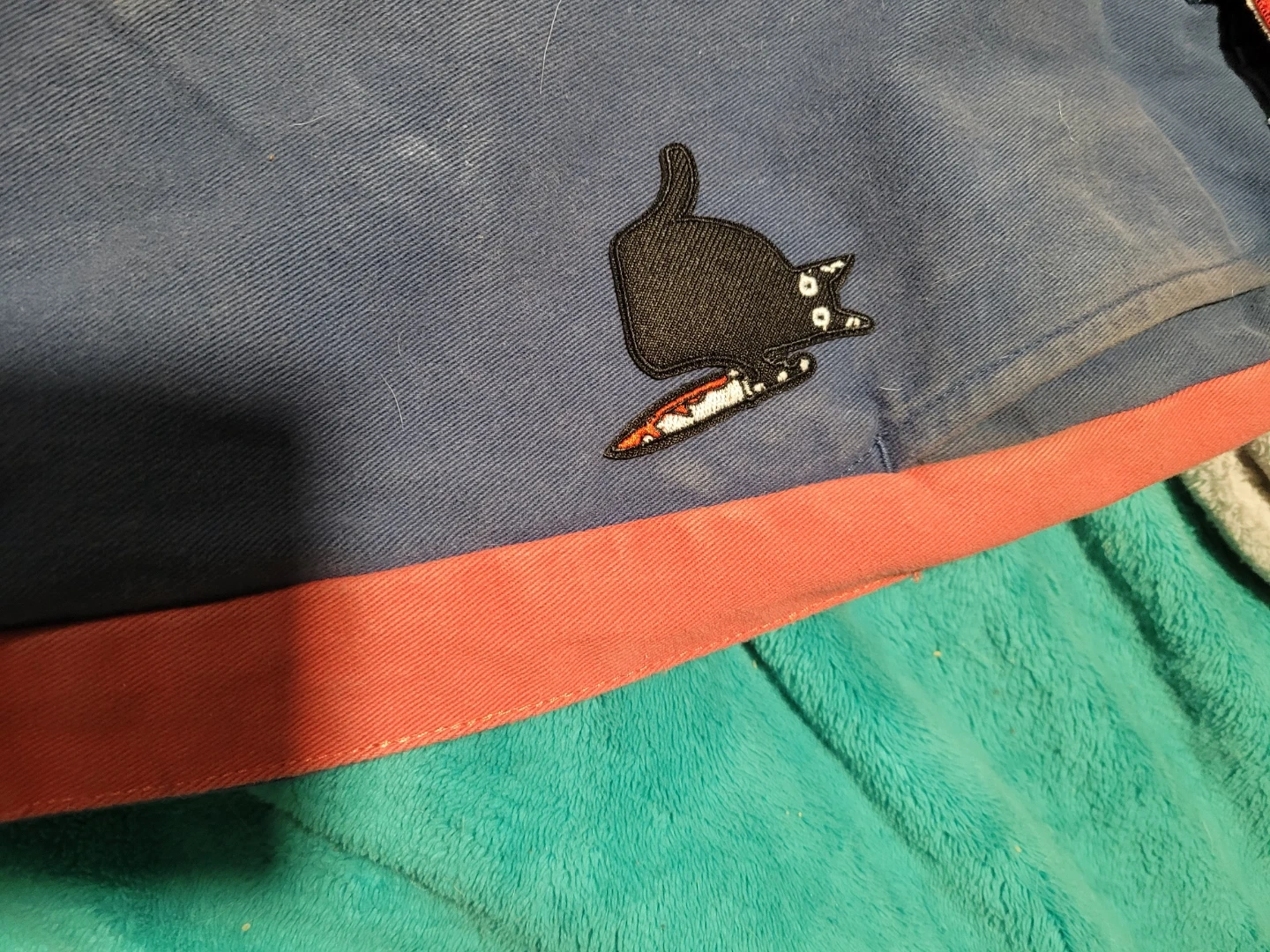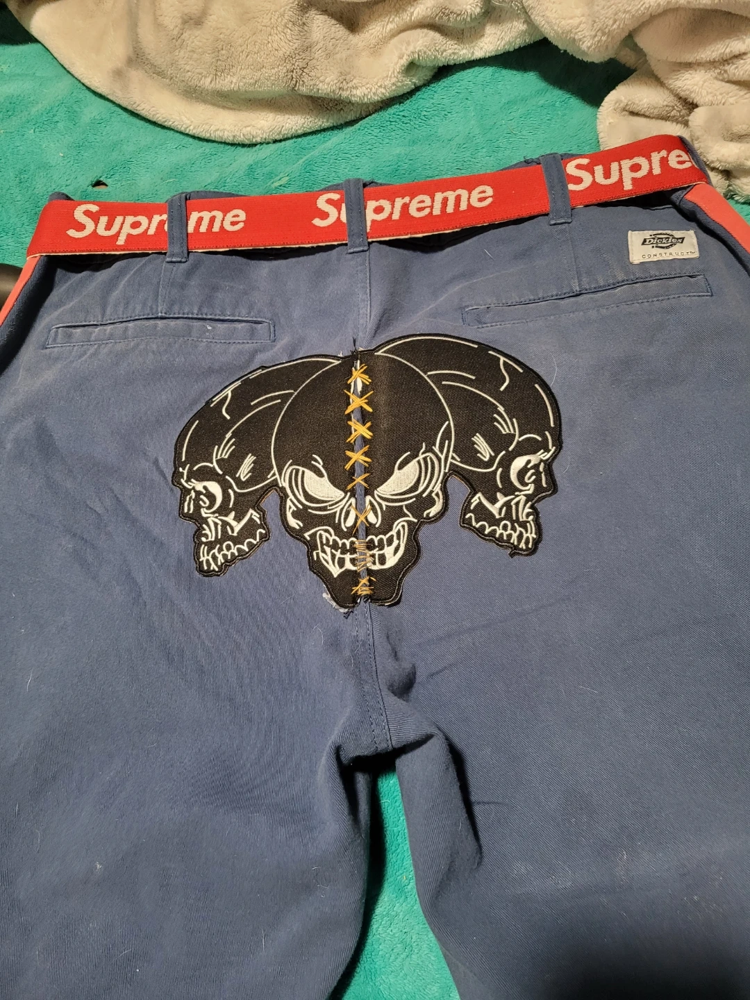 These Dickies custom shorts feature a prominent triple skull patch on the back with contrasting stitching. They also have a unique black cat with a knife patch on the front. The waistband is branded with 'Supreme' lettering, and there are red side stripes. The material appears to be a durable cotton blend, suitable for casual wear. Adds a unique flavor to the upcoming summer outfits..