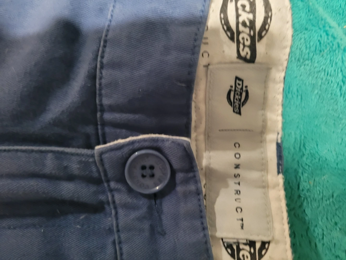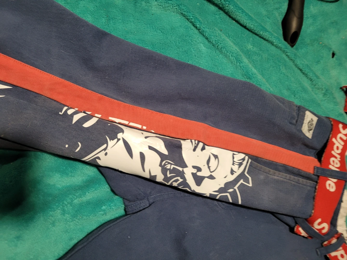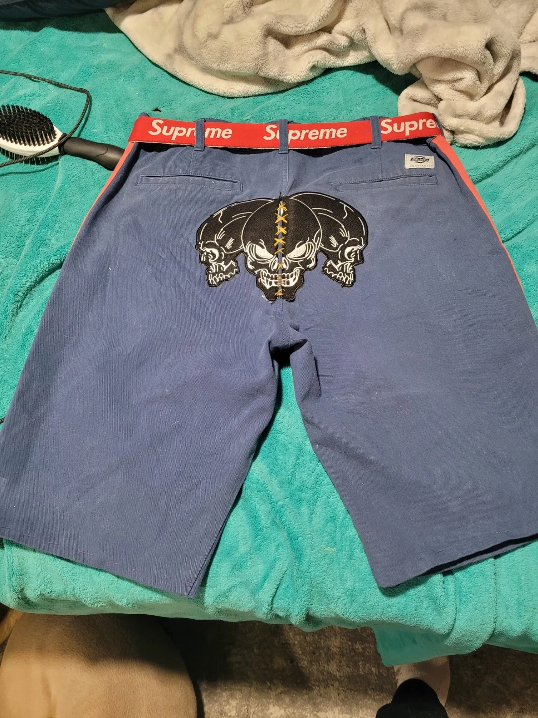 These Dickies custom shorts feature a prominent triple skull patch on the back with contrasting stitching. They also have a unique black cat with a knife patch on the front. The waistband is branded with 'Supreme' lettering, and there are red side stripes. The material appears to be a durable cotton blend, suitable for casual wear. Adds a unique flavor to the upcoming summer outfits..