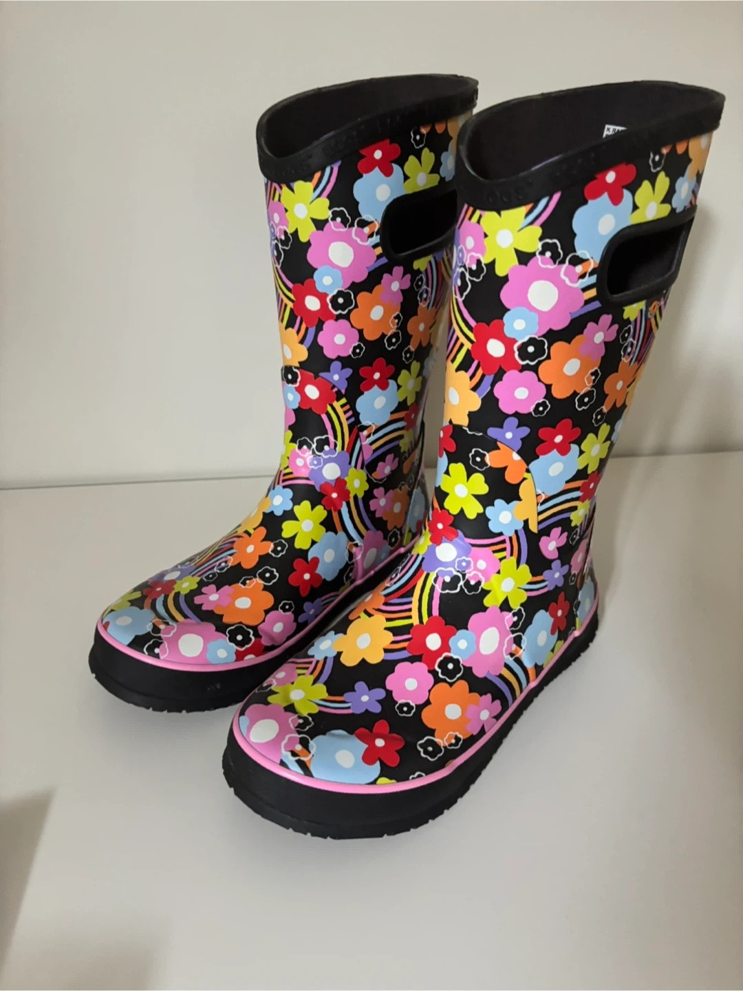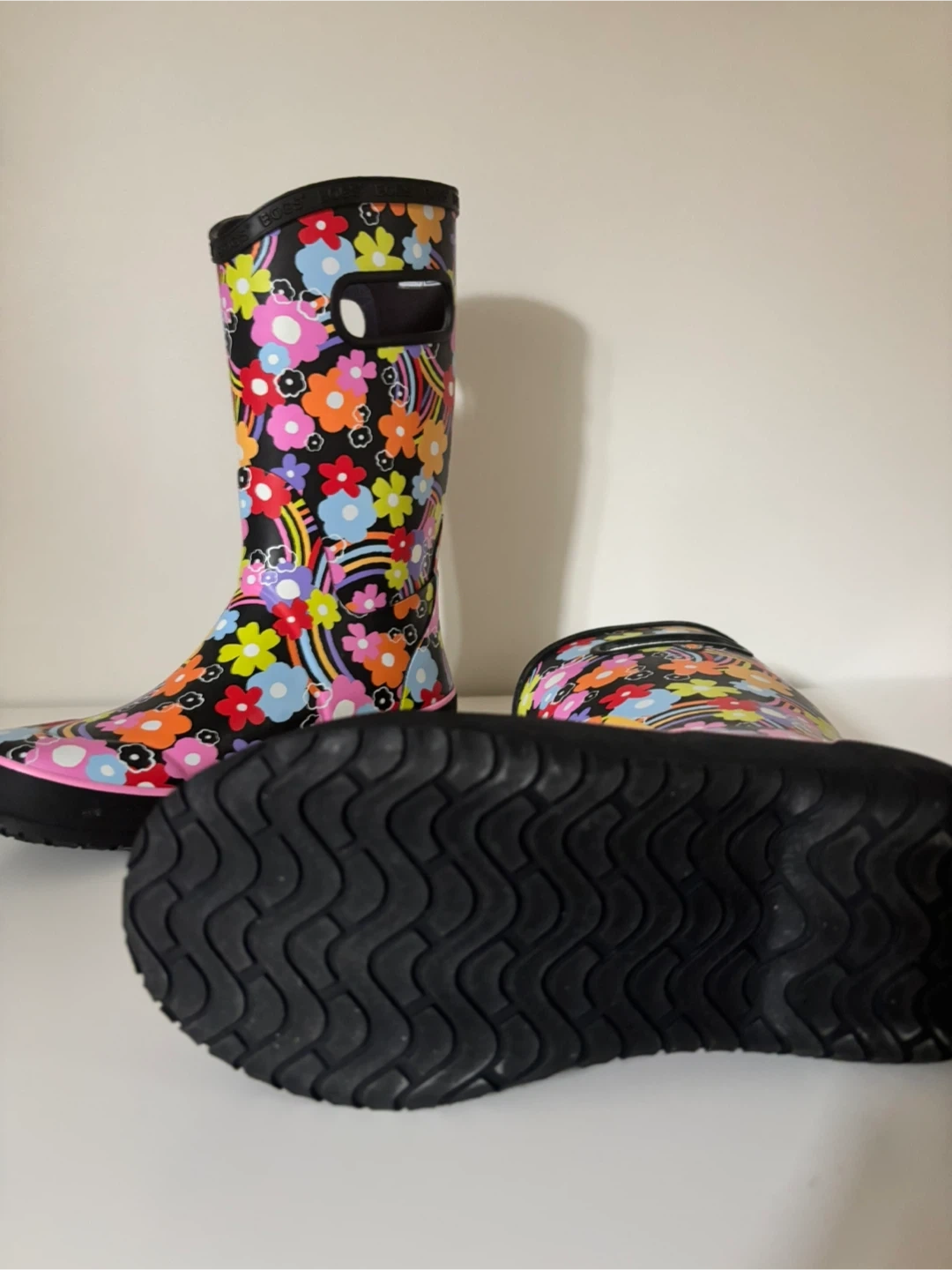 Cute and colourful floral patterned Bogs rain boots for youth. Size 5 US / 38 Euro. Perfect for puddle jumping on rainy days!