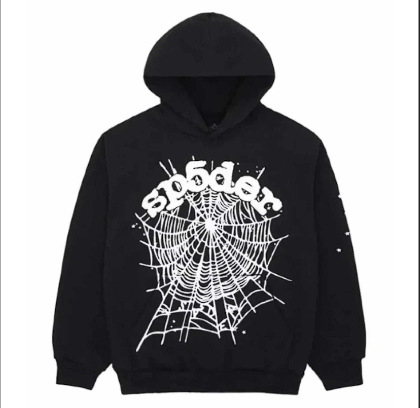 Black Spiderworldwide hoodie with a white spiderweb graphic on the front. It features a drawstring hood and a kangaroo pocket. Cotton blend material. 1 of 1 rep. Check acc for other colours.