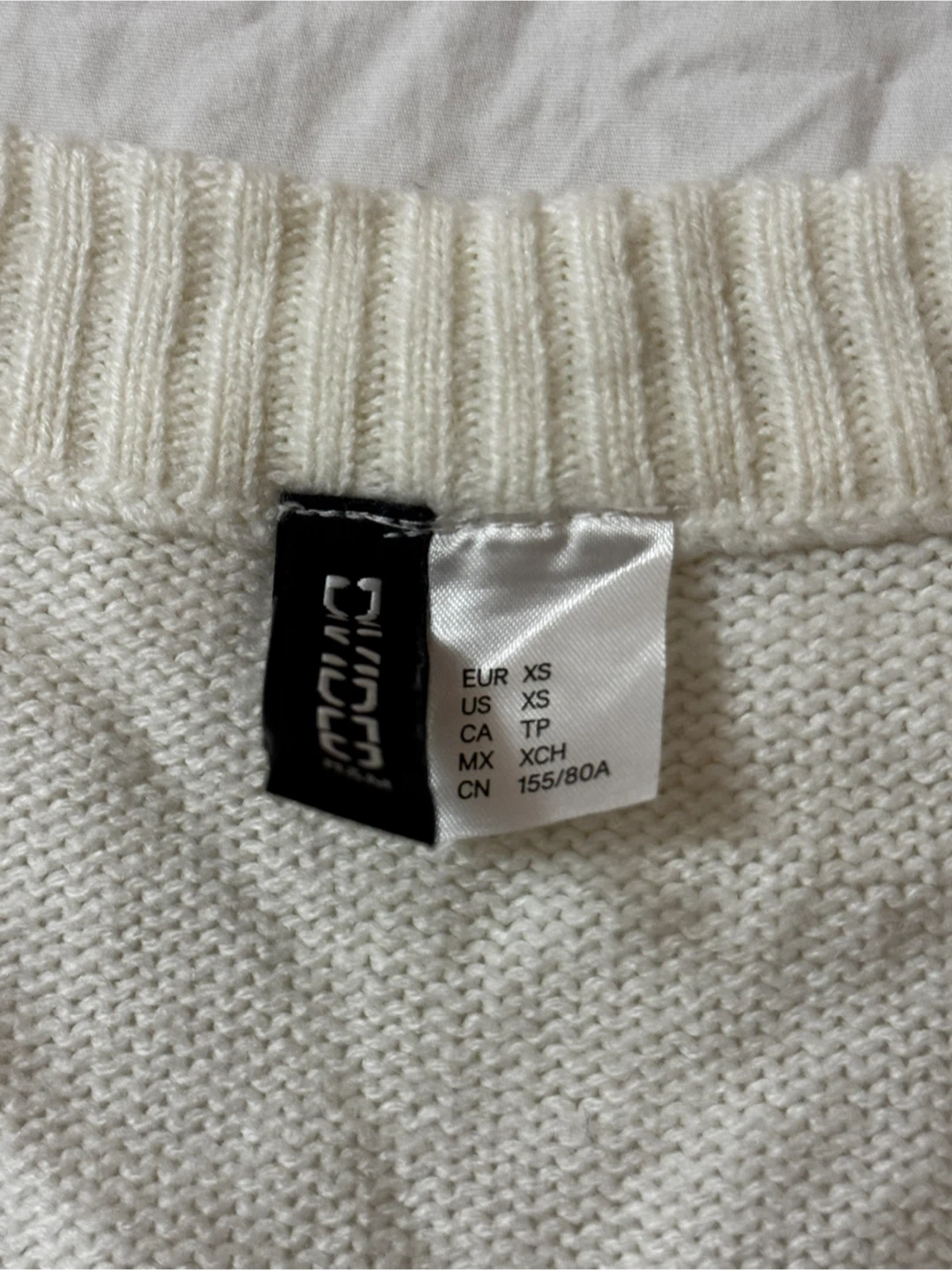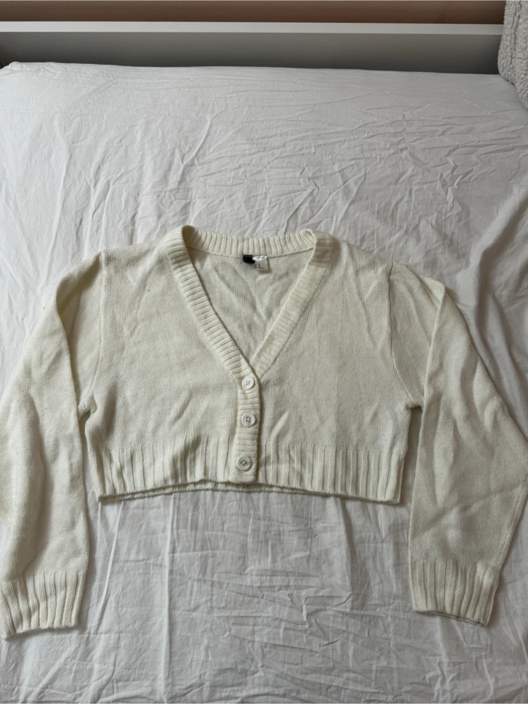 This is a white cropped cardigan from H&M Divided. It's size XS and features a button-up front. The material feels like a soft knit.