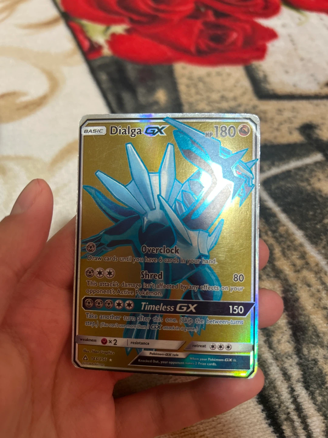 This is a Dialga GX Pokémon trading card. It features the 'Overclock' and 'Timeless GX' abilities. The card is from 2018 and is set 146/156.