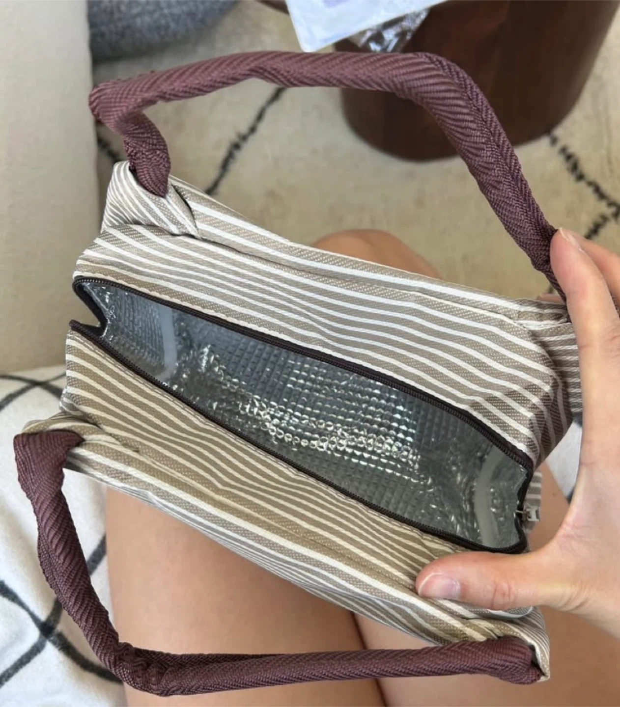 Selling a brand new striped lunch bag! It's perfect for women, packaged thermal bag, or kids. It's a lunch pack refrigerator bag in colour khaki
