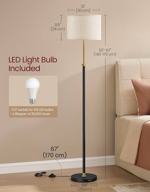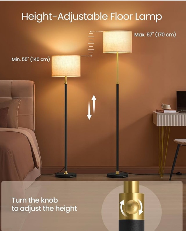 Brighten up your living space with this new VASAGLE floor lamp, featuring adjustable height and a sleek design perfect for any living room. The lamp provides ample lighting with its quality fabric shade, offering soft, diffused light for a cozy atmosphere.