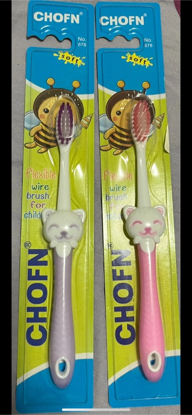 Selling two CHOFN toothbrushes designed for kids! These have soft bristles and a flexible wire brush. One is pink and the other is a light purple. Perfect for little ones!