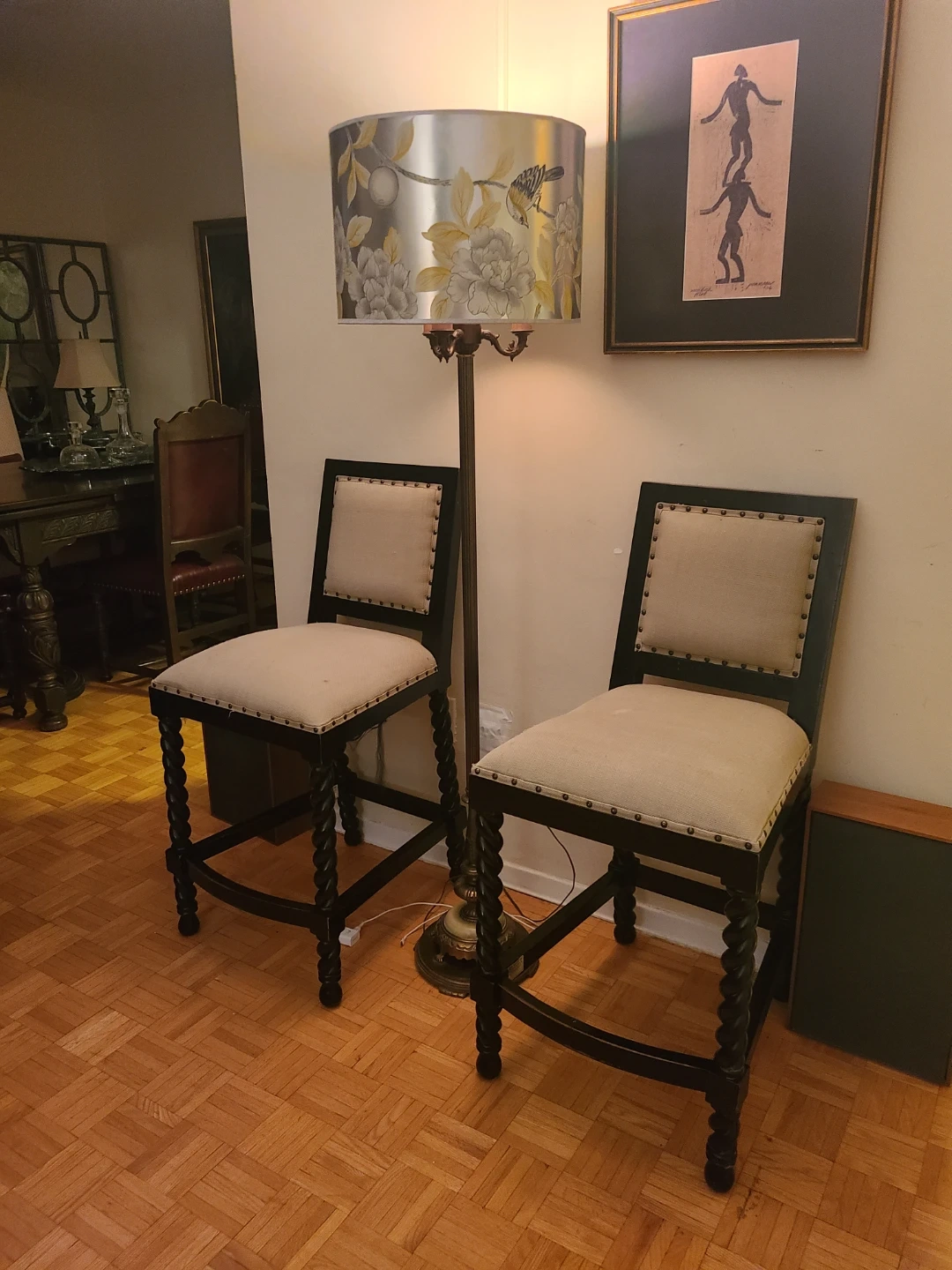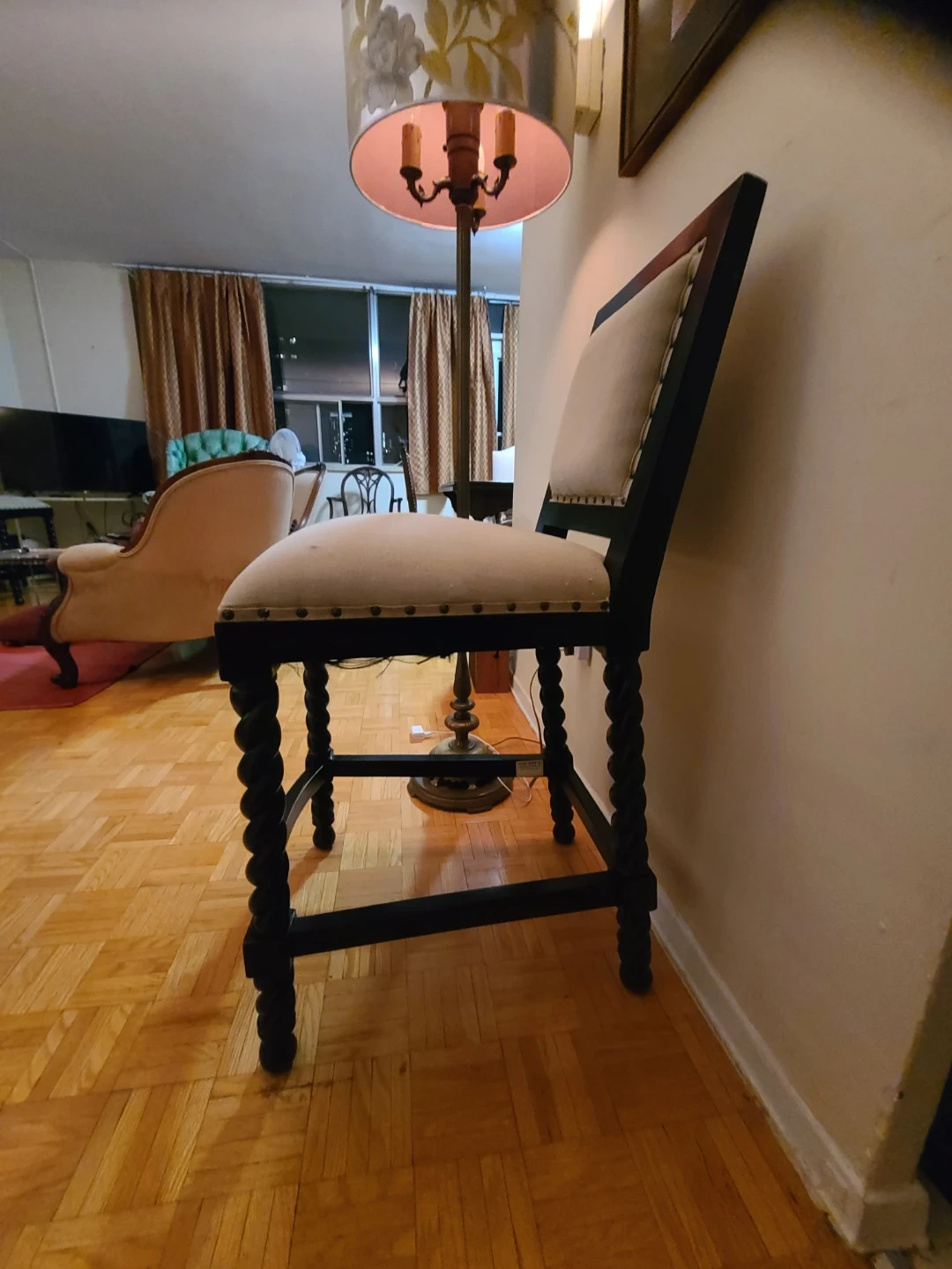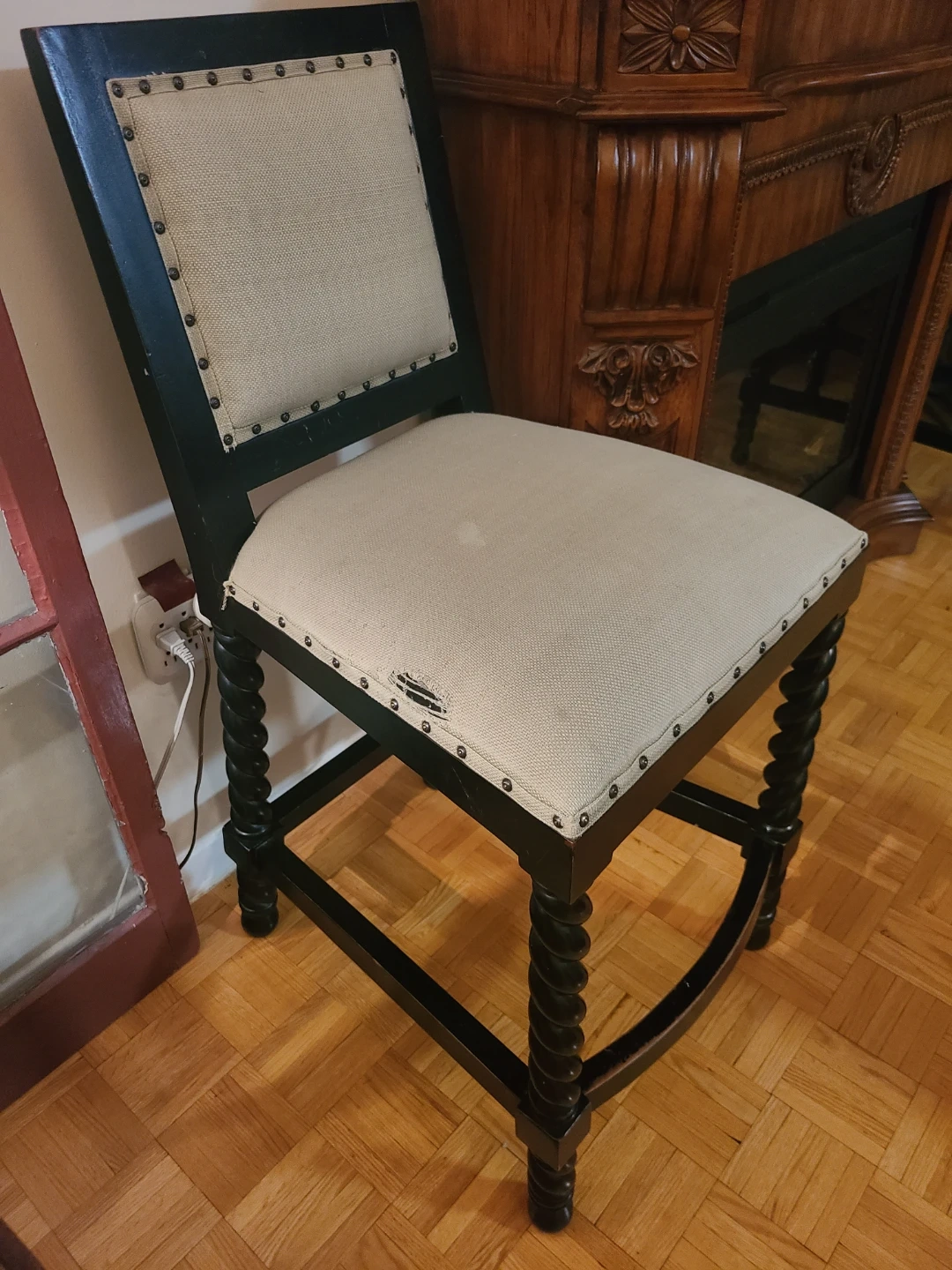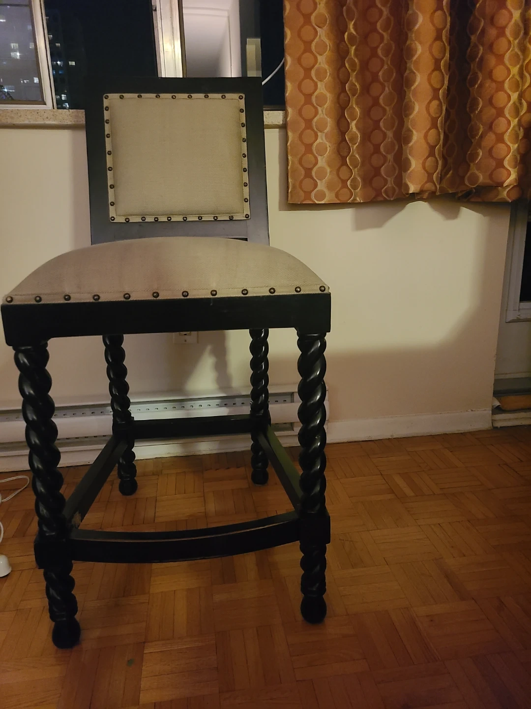 Selling a sturdy bar stool with a black frame and beige cushioned seat and back. It features unique twisted legs and a classic design. It's perfect for adding a touch of elegance to your kitchen or bar area!