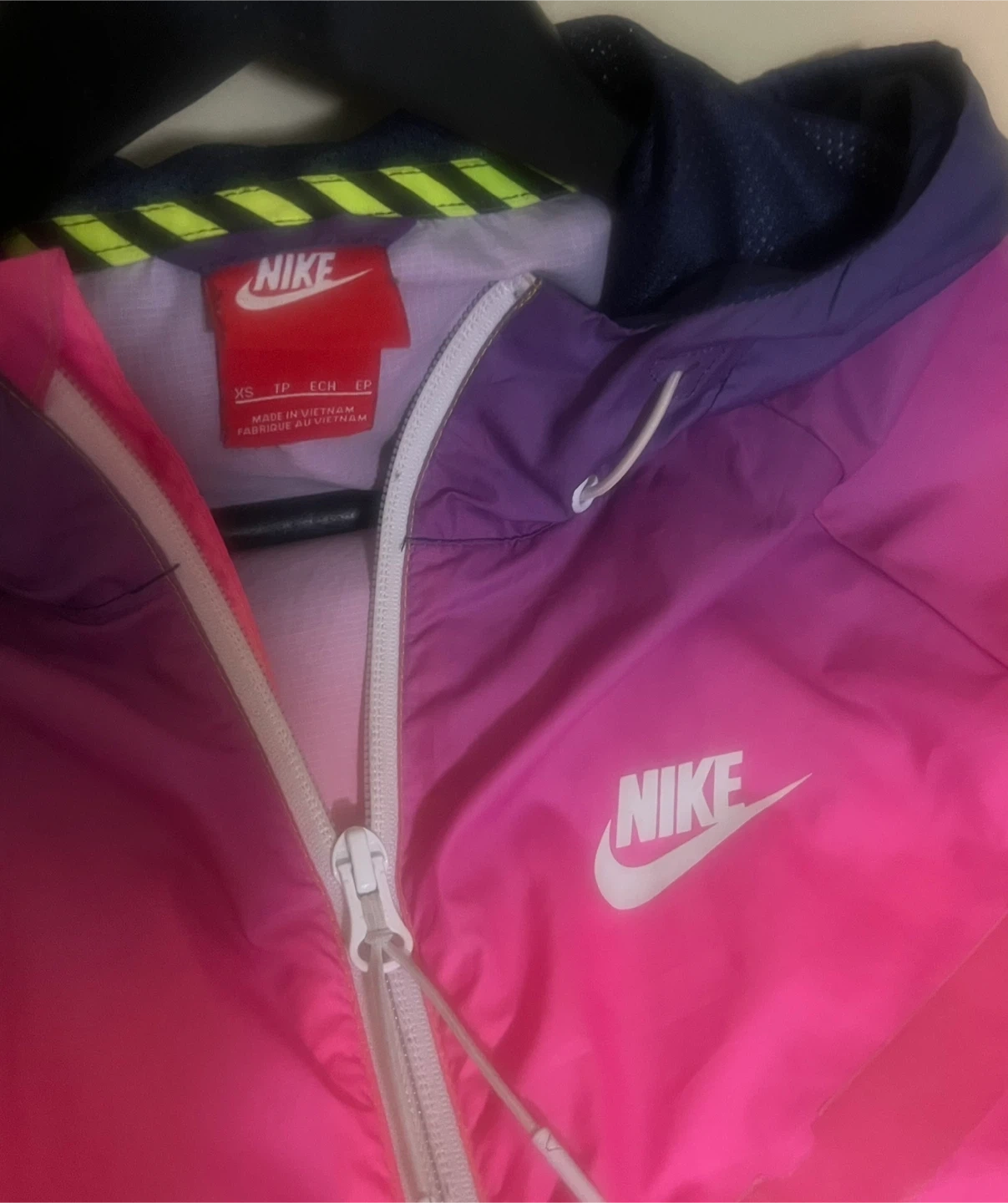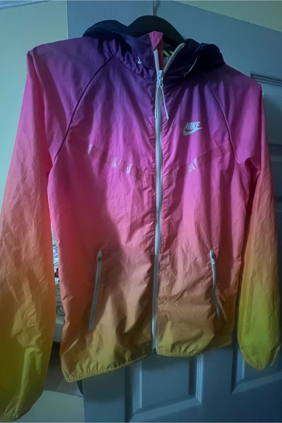 This is a Nike hooded windbreaker jacket. It's a size XS but for Medium and features a full zipper closure with two front pockets. The jacket has a cool ombre colour effect from purple to pink to orange and yellow.