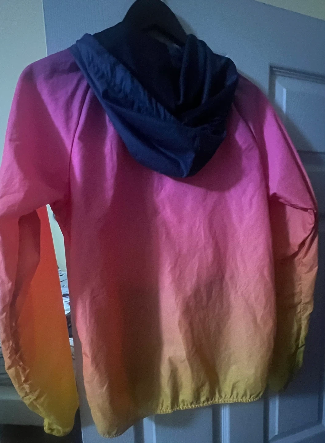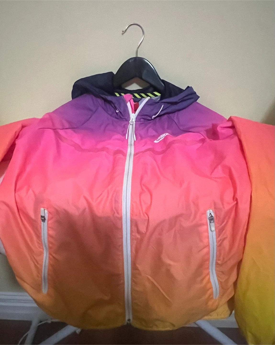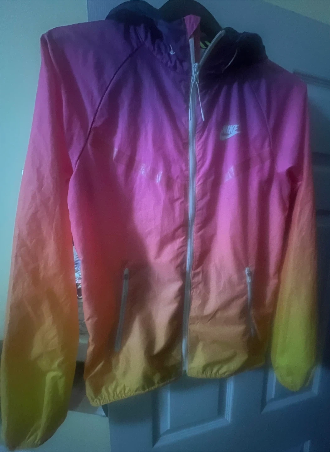 This is a Nike hooded windbreaker jacket. It's a size XS but for Medium and features a full zipper closure with two front pockets. The jacket has a cool ombre colour effect from purple to pink to orange and yellow.