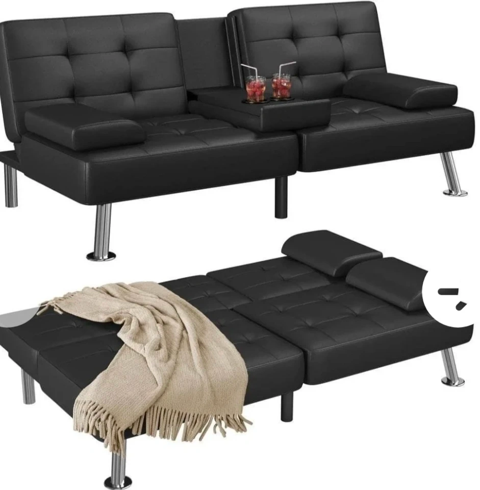This versatile futon sofa easily converts into a bed. It's upholstered in black faux leather and features a centre console with cup holders. The sofa bed dimensions are 65" L x 38" W x 14" H when unfolded.