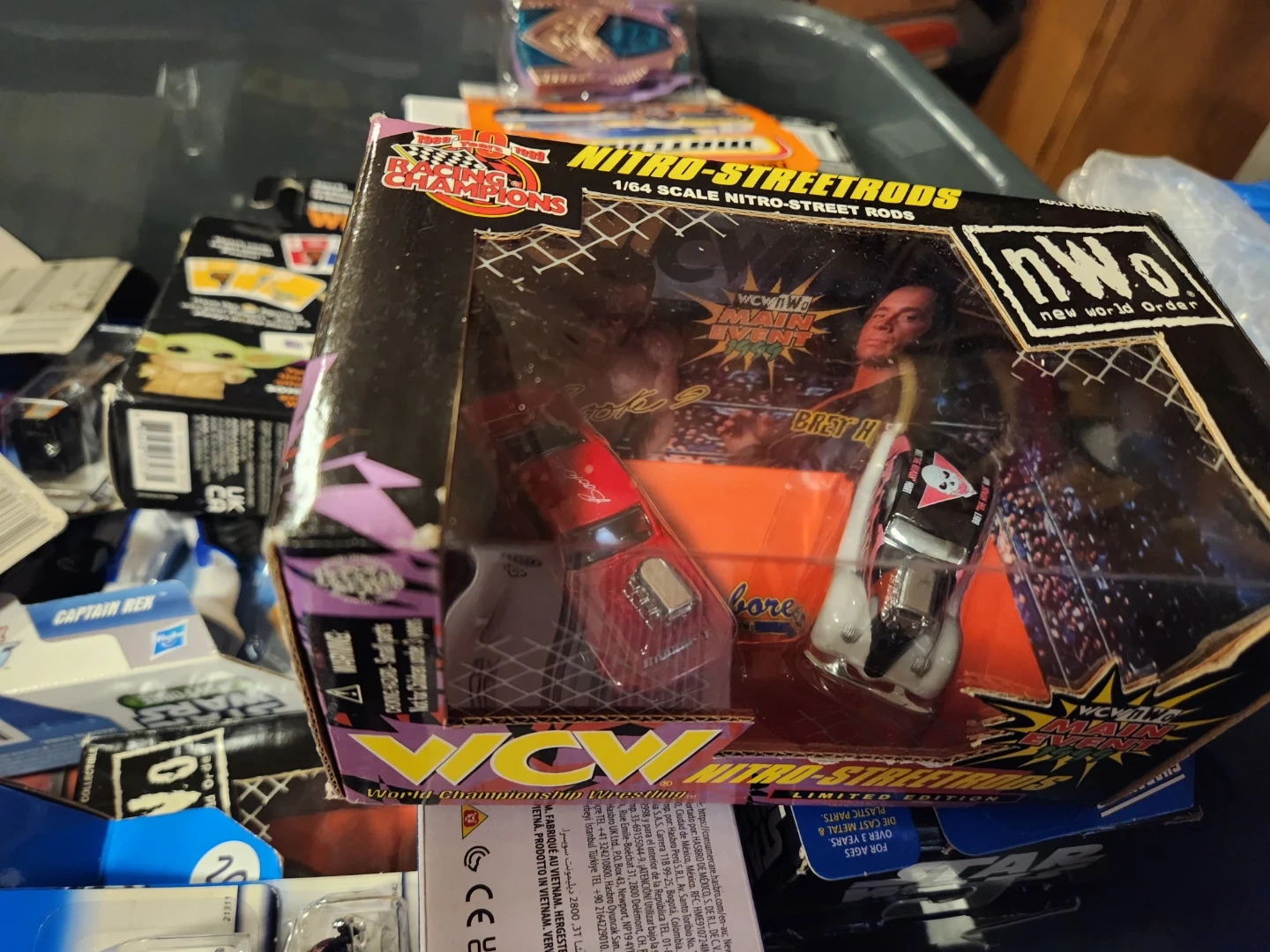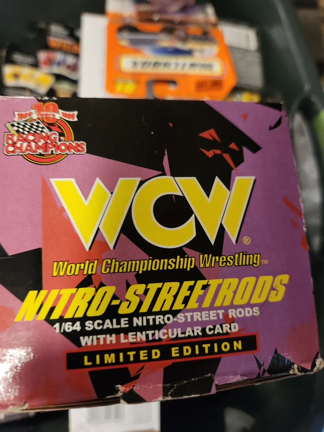 This is a limited edition WCW Nitro-Streetrods 1/64 scale nitro-street rods set from Racing Champions. It includes a lenticular card. The packaging shows wear but the item appears to be in good condition.