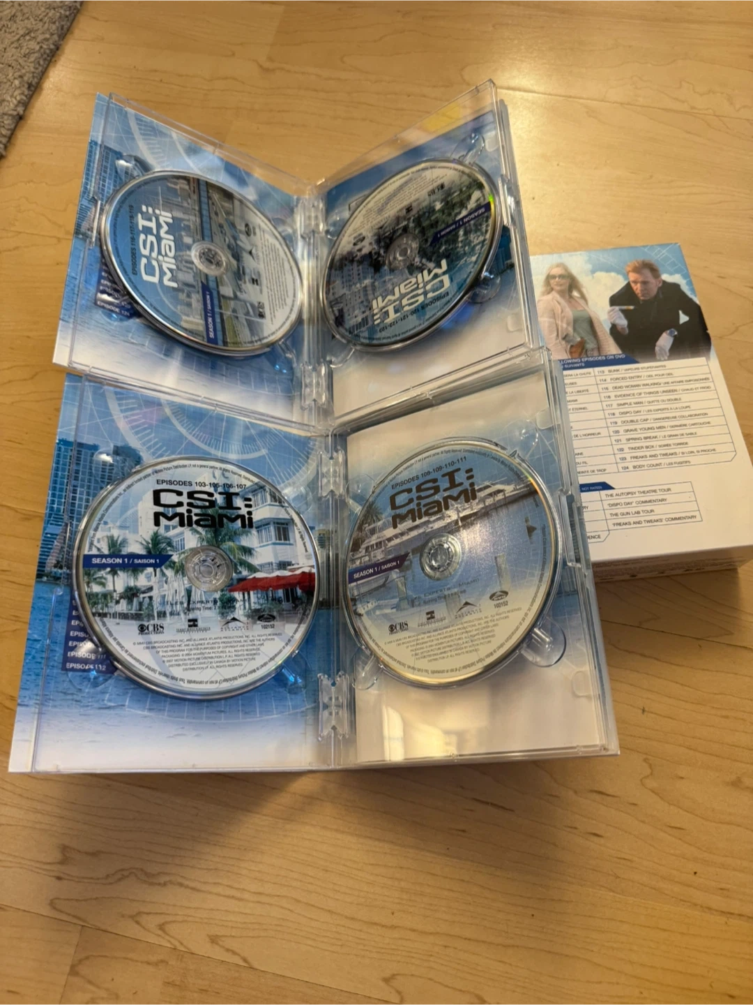 This DVD box set includes CSI: Miami, The Complete Season One. It features all episodes from the first season, plus DVD extras. All discs are included.