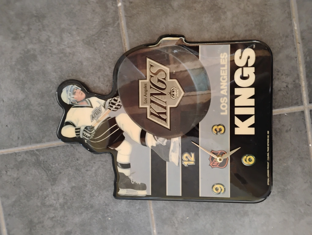 Selling a Los Angeles Kings hockey wall clock. Features the team's logo and a player graphic. A cool piece for any hockey fan's collection!