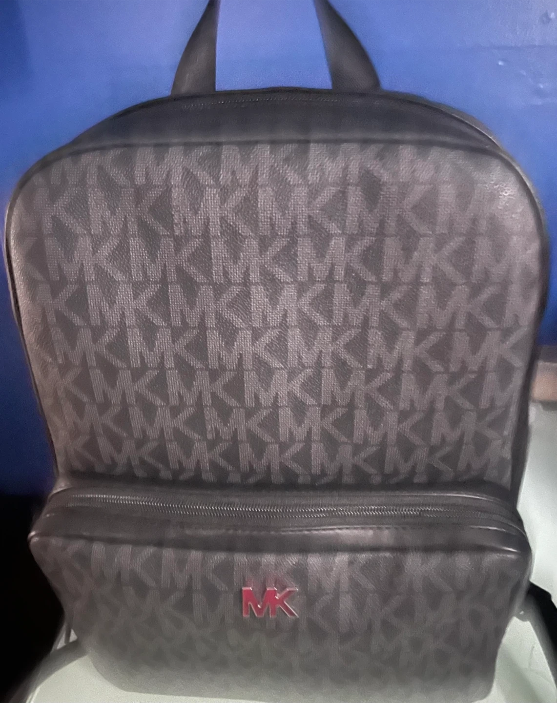 Michael Kors backpack with signature MK all-over logo print. Features a front zip pocket with a metallic MK logo detail. Made from durable coated canvas.
