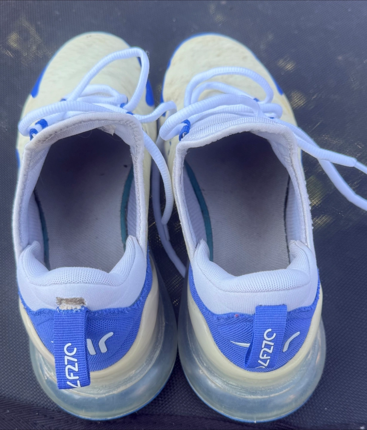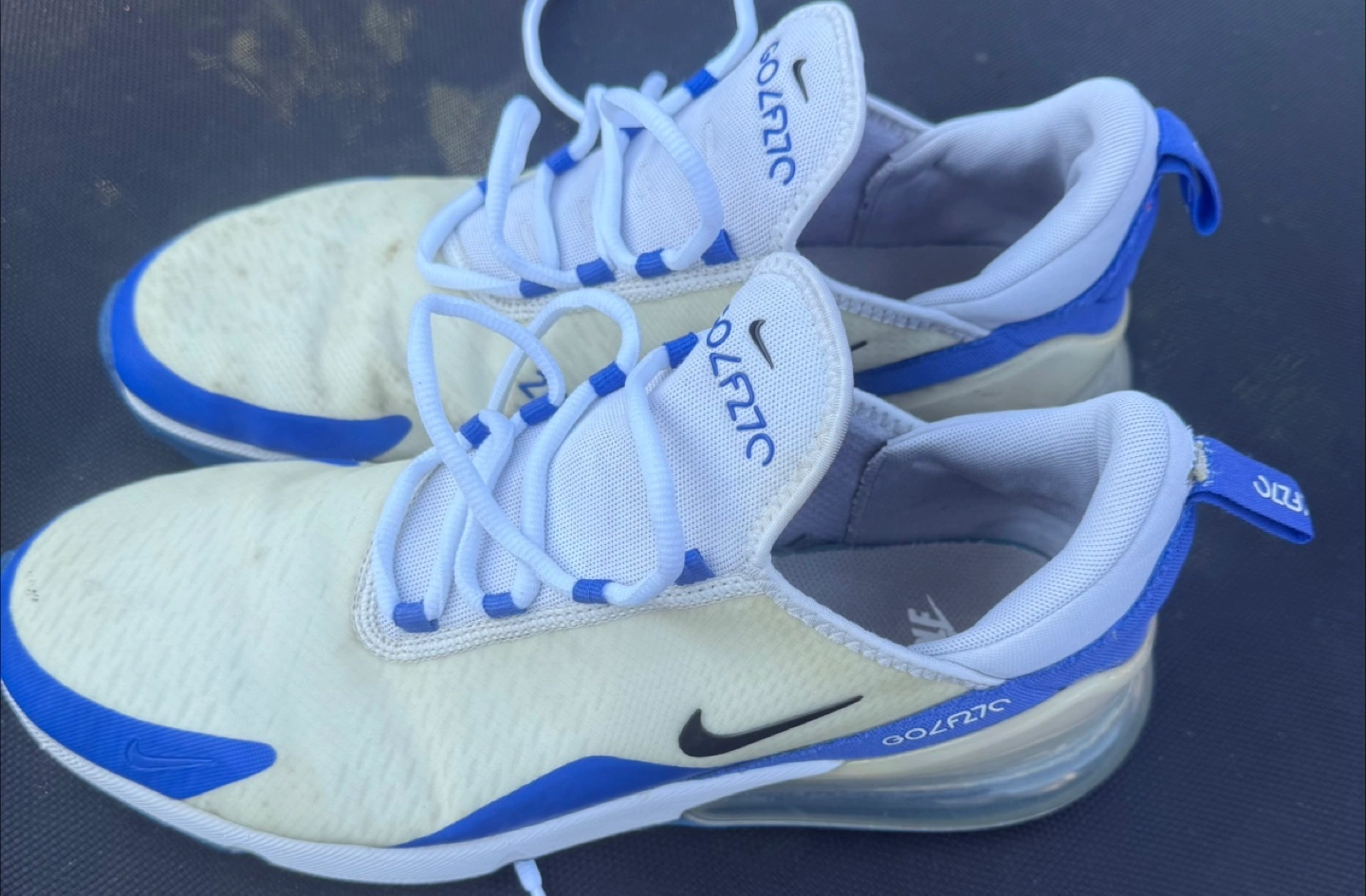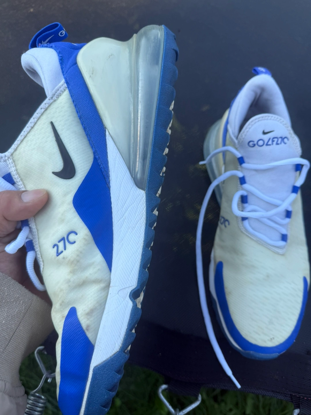 Selling a pair of Nike Air Max 270 golf shoes in a white and blue colourway. They show signs of wear, as you can see in the photos. Great for the golf course!