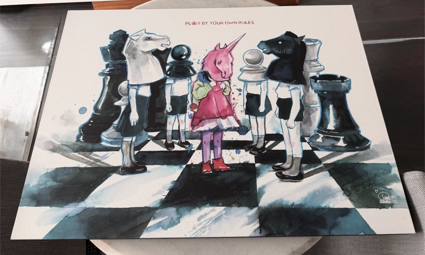 This is a Lora Zombie canvas print titled "Play By Your Own Rules". It's ready to hang and made in Canada. This unique piece adds a pop of colour and style to any room!
