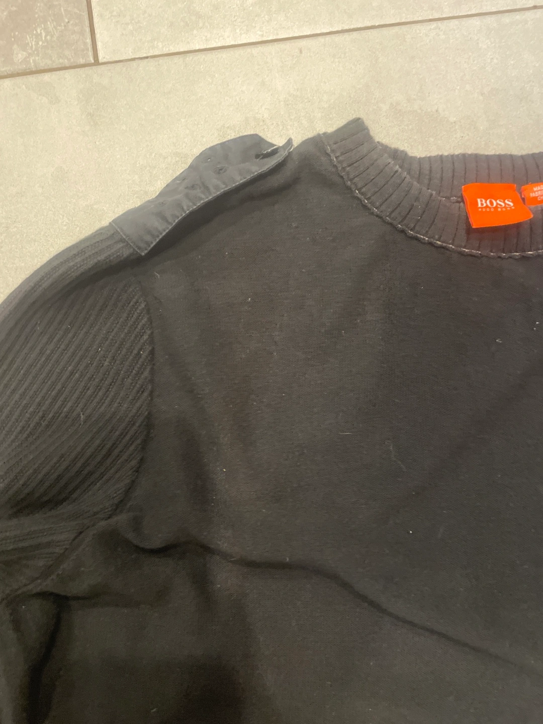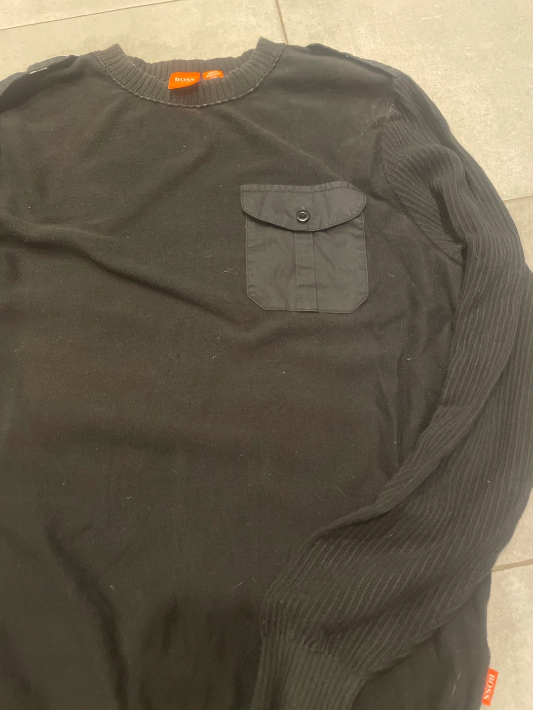 Men's black Hugo Boss sweater. Size large. Features ribbed detailing on sleeves and a small pocket.