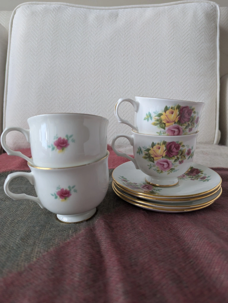 Set of 4 teacups and 4 saucers with colorful cabbage rose pattern. Made in England. From the Madelaine series made by Royal Canterbury. Real Bone china.