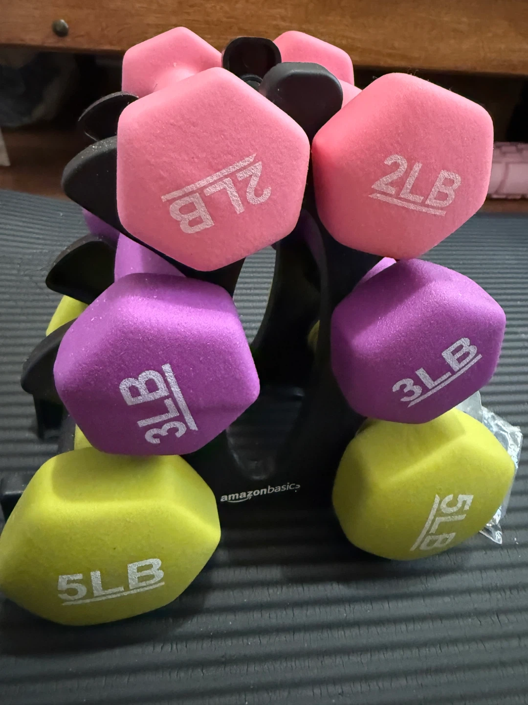 This set includes pairs of 2lb, 3lb, and 5lb dumbbells in pink, purple, and yellow. They have a comfortable grip and come with a handy rack for storage. Weights are clearly marked for easy identification.